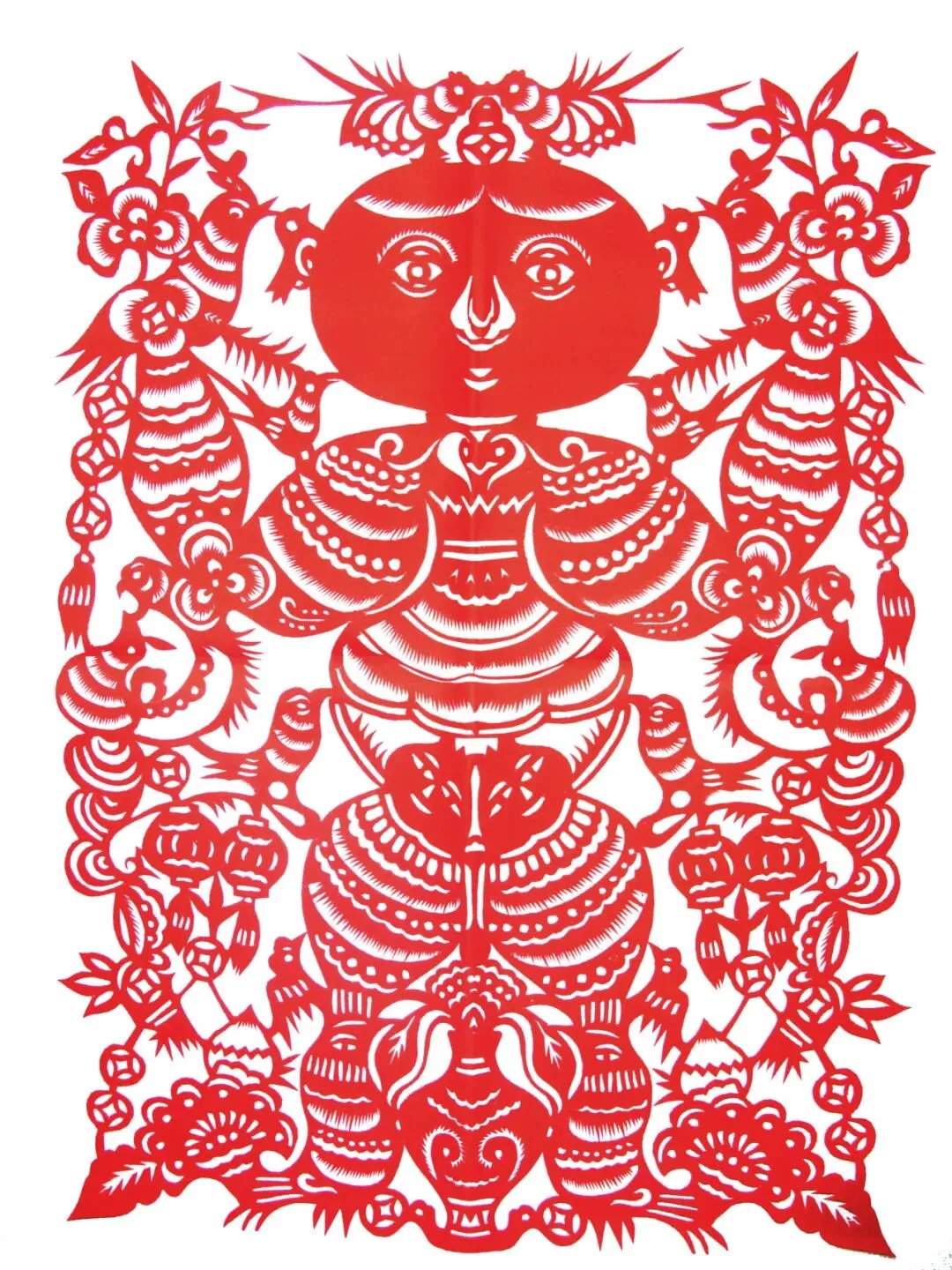 此幅喜女抓髻娃娃,抓髻娃娃圆润饱满,浓眉大眼,活泼可爱。画面中的鸡属阳之物,喻男性,贯钱喻女阴,牡丹属阳,整幅剪纸反映了“阴阳相合,化生万物”的中国传统生命哲学观念。