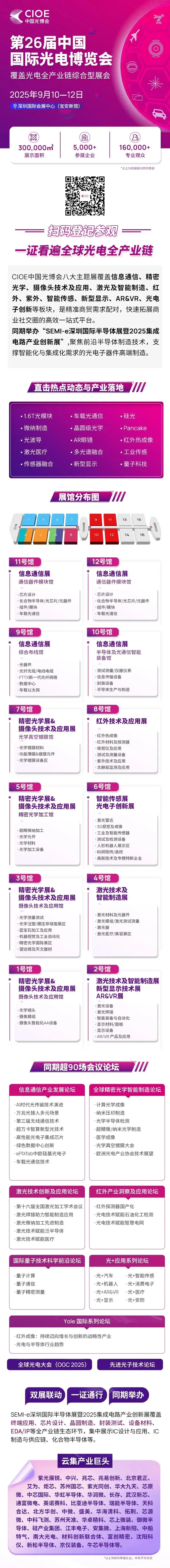 CIOE将于9月10-12日在深圳国际会展中心(宝安)开展,今年展示面积达24万㎡,超3800家参展商覆盖信息通信、光学、激光、红外、传感、新型显示、光电子创新、AR&VR等光电全产业链板块,同期还有超90场产业、应用、国际及学术论坛,光电盛会开幕在即,准备好了吗!