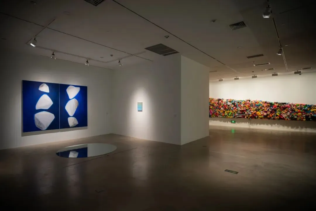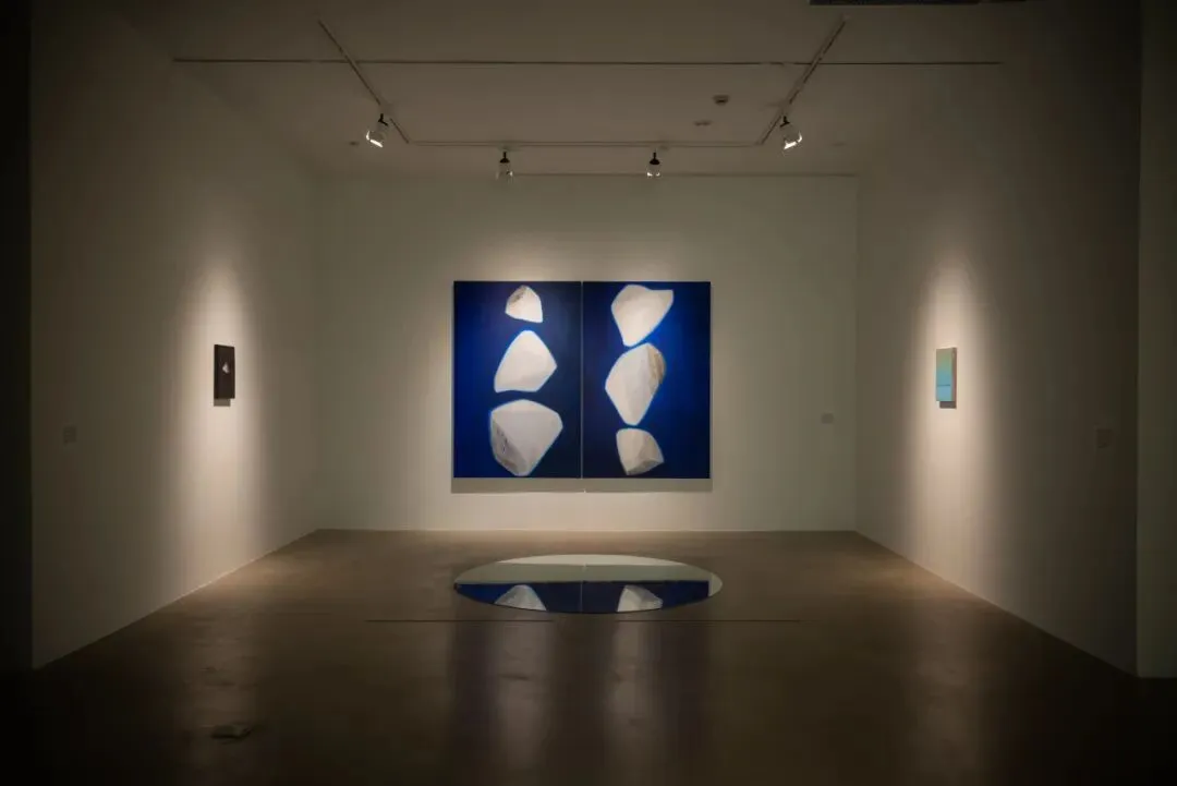 石头具有一种先天的两面性,它既是一种典型的传统认知中的非生命对象,也是作为具有文化象征性的活跃符号。它既简单,又有无限的分类与差异性结构。简而言之,石头是物中之物,其在不同状态间左右摇摆的特性正符合艺术家在创作中追求的“临界”状态,在完全的抽象化与(有可能枯燥的)对象化之间,在镜面上摆弄各种石头并将其转化成无尽的画面关系,以此作为“绘画自身形式或语言上的转换方式。”(石至莹语)