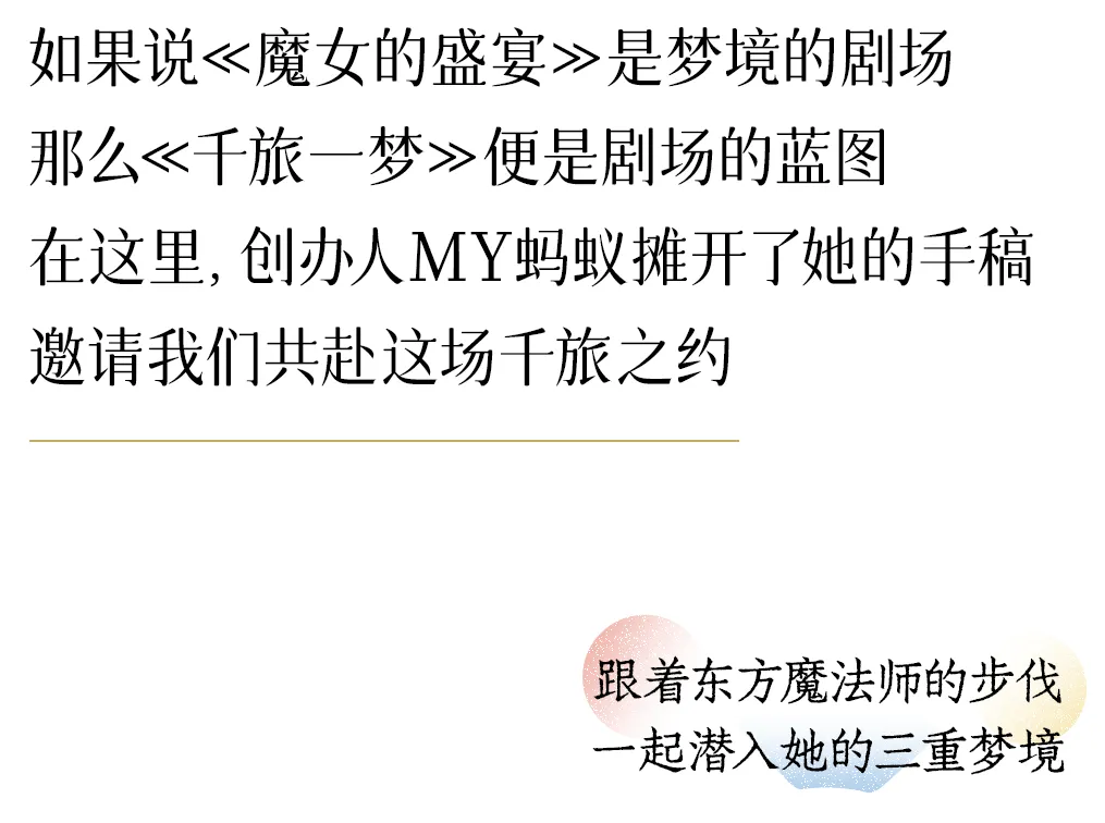 如果你不太熟悉MY蚂蚁,或许也听过国内唯一有Dress Code的沉浸艺术展——魔女的盛宴。创办人MY蚂蚁(陈祖儿)的艺术个展《千旅一梦》现已在深圳万象天地MXTR Gallery正式展出。