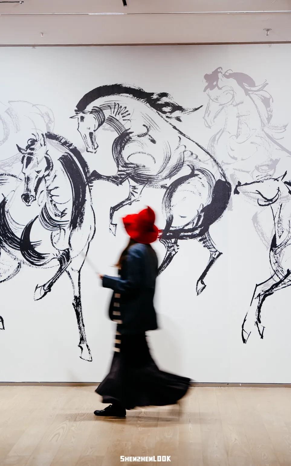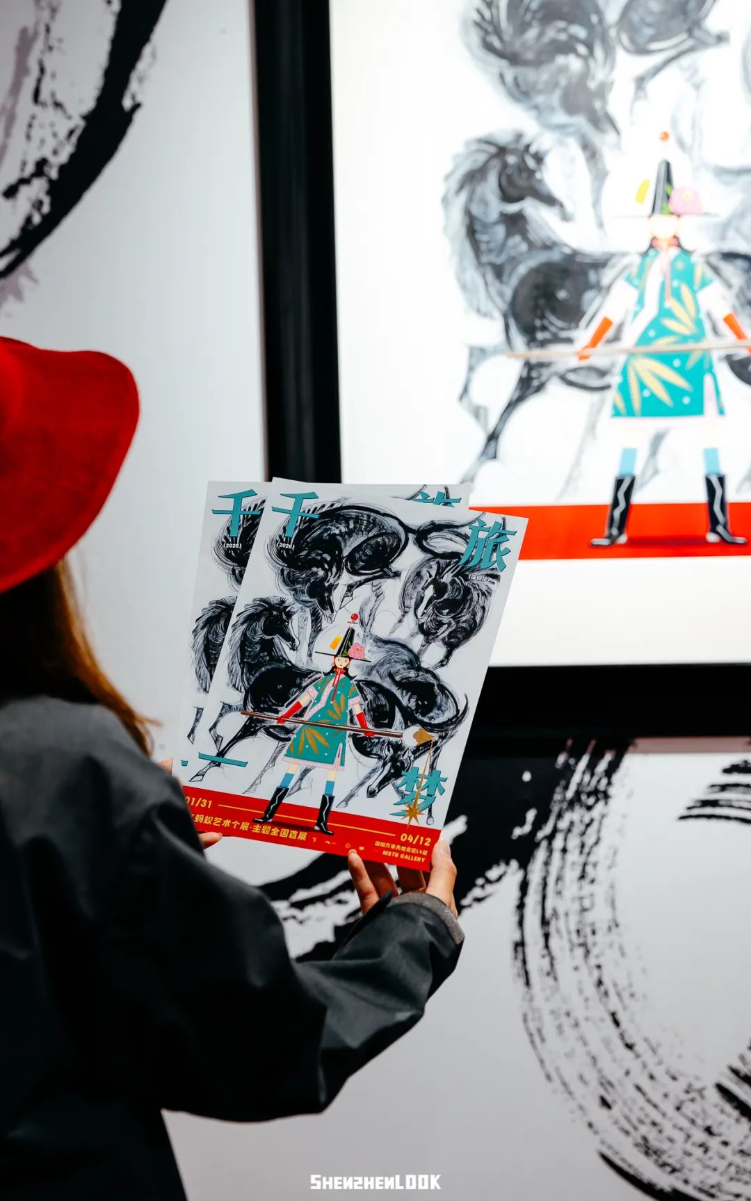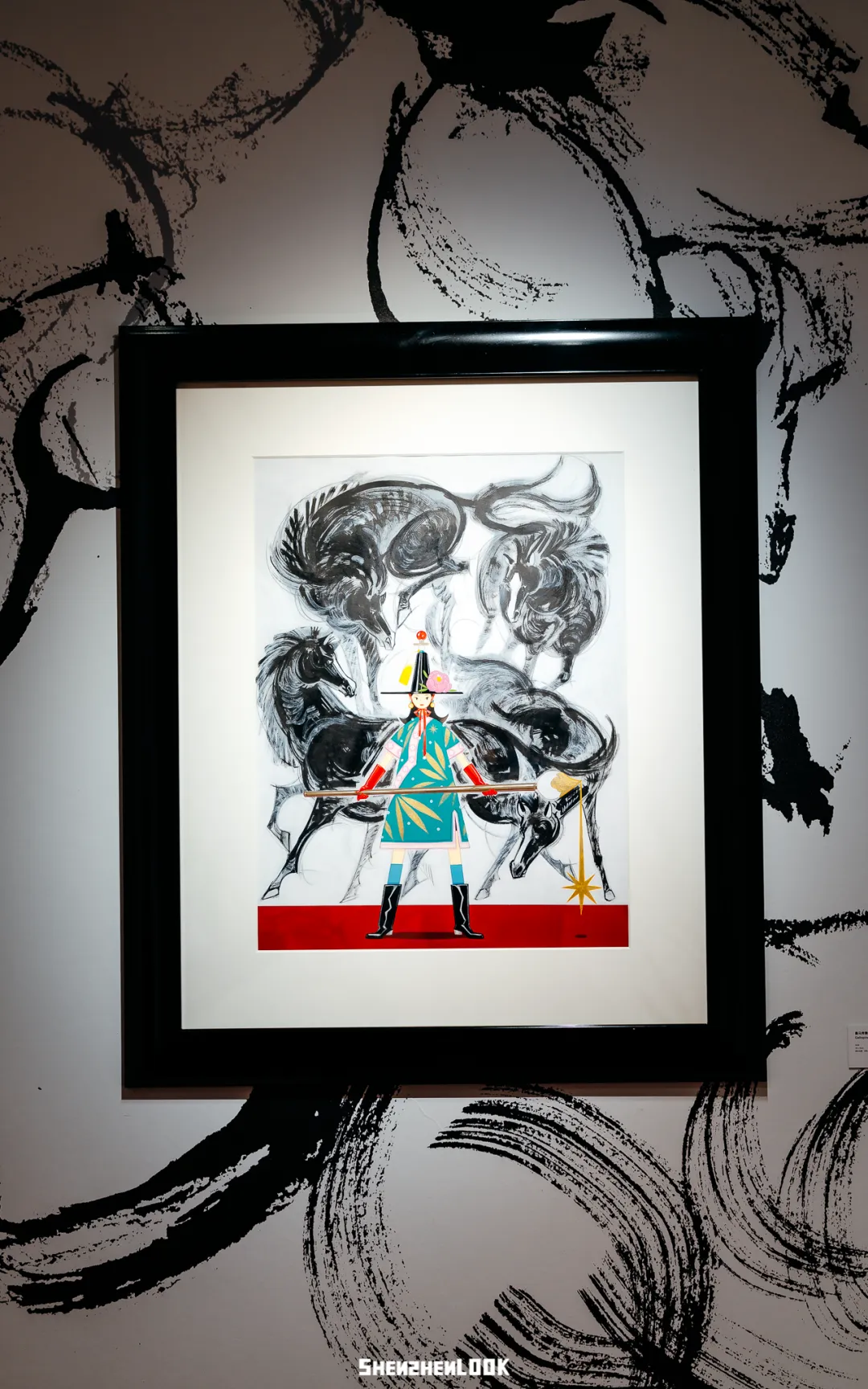 《奔腾墨马》作为本次展览的主视觉作品,是蚂蚁专为马年创作的,以竹签毛笔写意勾勒。她给我们讲解道,这幅画前面是穿着新中式服饰的孔玲娜,后面是写意的墨马,年轻多元的表达和沉淀的传统概念相碰撞,展现出了东方文化的张力。