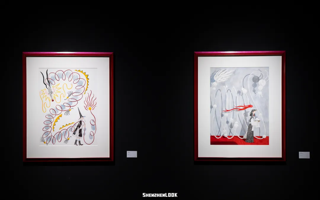 在她笔下,龙可化作丝绸、绸缎、一笔线条或珍珠波浪,马以写意速写呈现,虎与蛇各有具象与抽象的表达。