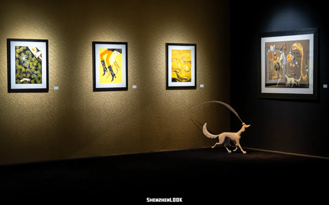 展览的最后一个展区,所有色彩汇聚在一个空间内。这里陈列的,既有蚂蚁以往的画作,也有《魔女的盛宴》原作。蚂蚁会开心地给我们指出藏着的巧思:田字格元素能化作高定服装,削铅笔也可以是裙摆缓缓铺展的过程,文字也能变成生肖造型,这些元素自然地融入她的画作中。