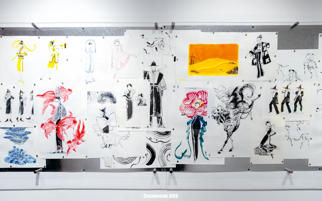 展区的最后还有一面手稿墙,展示了上百张蚂蚁的创作手稿,她称之为“碎碎念”。这百余张草稿,重复叠加的线条与修改痕迹依稀可见,这些墨水在木浆纸的呈现下为晕染开的肌理,记录着最原始的灵感迸发。