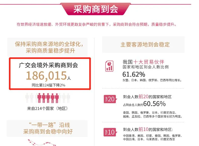 根据第216届(2019年)的数据,参与广交会的境外采购商达到18万+,而大部分的采购商来自目前疫情感染的高风险国家,例如日本、韩国、美国等。
