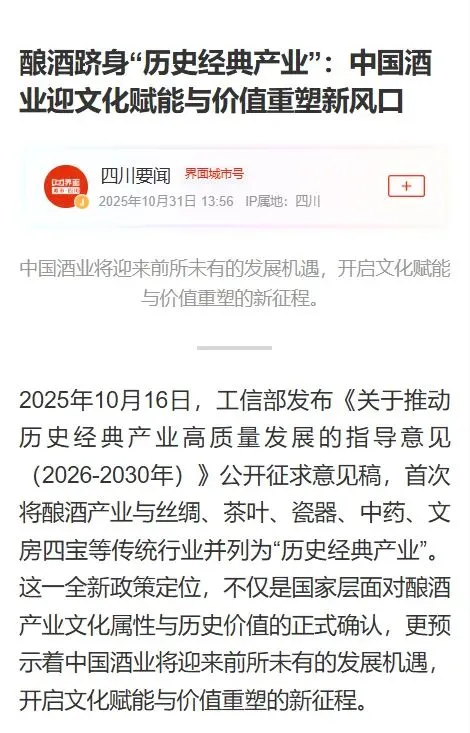 2025年10月16日,工业和信息化部首次将白酒等酿酒产业,与丝绸、茶叶、瓷器、中药、文房四宝等承载千年文脉的国粹,一同纳入历史经典产业范畴。这一定位,正式为白酒等美酒正名:果腹是生活之本,饮酒是诗意之魂,诗情画意的水火温情才是美酒给与烟火人间与万家灯火的真正内核!