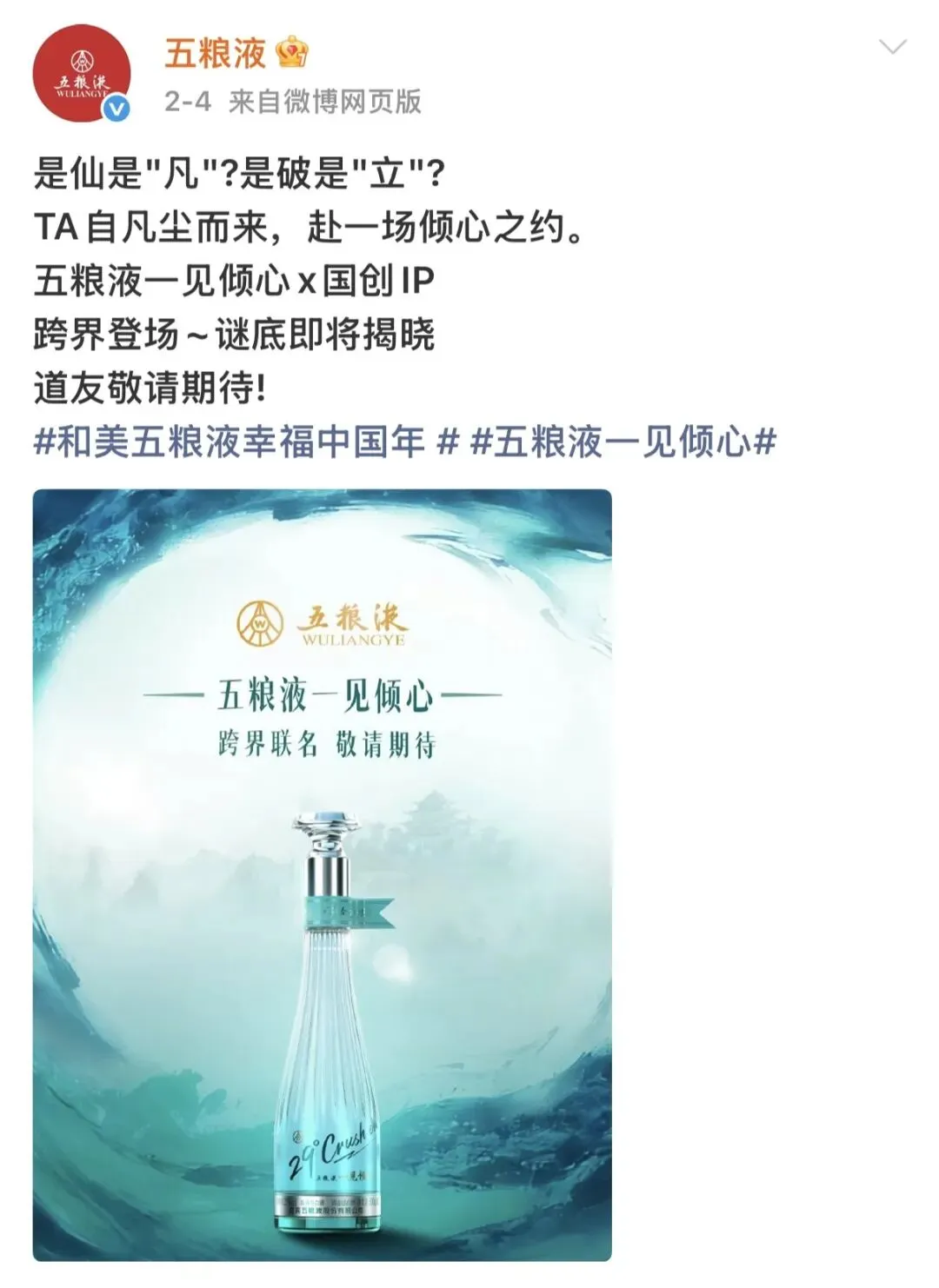 再然后,2026年2月4日,与酒王茅台并称为“铁打的茅五”的浓香型白酒大王五粮液,又以字谜的形式官宣旗下的年轻化产品29°五粮液一见倾心跟有着国漫巅峰之称的《凡人修仙传》正式跨界联名,再度引爆全网,为白酒行业的年轻化、低度化、时尚化、潮流化进程再添标杆案例,这是一场由一线名酒牵头的让年轻人先喜欢上白酒的“阳谋”,当年轻人发现白酒也是这么好喝也是这么好玩的时候,顺势让真正能代表咱们白酒风味之妙的高品质高度白酒,被他们接纳和喜爱,也就成了水到渠成之事。