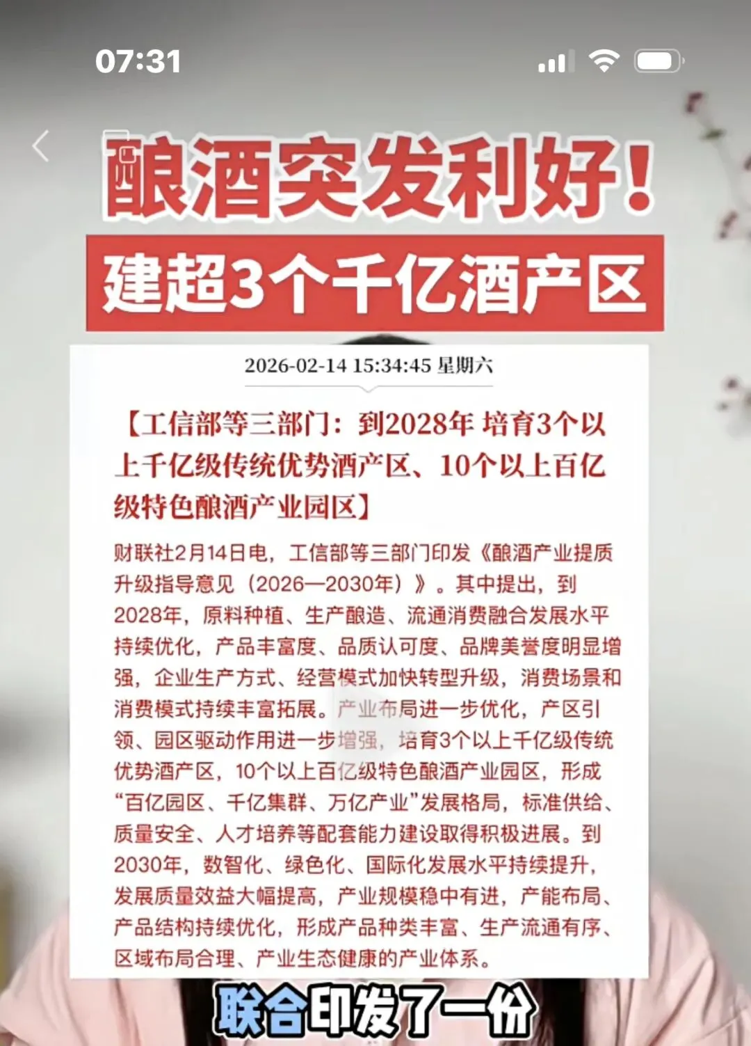 而在昨天,又迎来最新的重磅利好!2026年2月14日,工业和信息化部、人力资源社会保障部、市场监管总局三部门联合印发《酿酒产业提质升级指导意见(2026—2030年)》,意见内容很长,我挑我最感兴趣的两个点简单说说,大致就是接下来要联合推动白酒等酿酒业实现全方位的产业升级,培育3个以上千亿级传统优势酒产区,10个以上百亿级特色酿酒产业园区,形成“百亿园区、千亿集群、万亿产业”的发展格局,以及全方位打造沉浸式消费体验,让喝酒变成一种更潮的生活方式等等等等。
