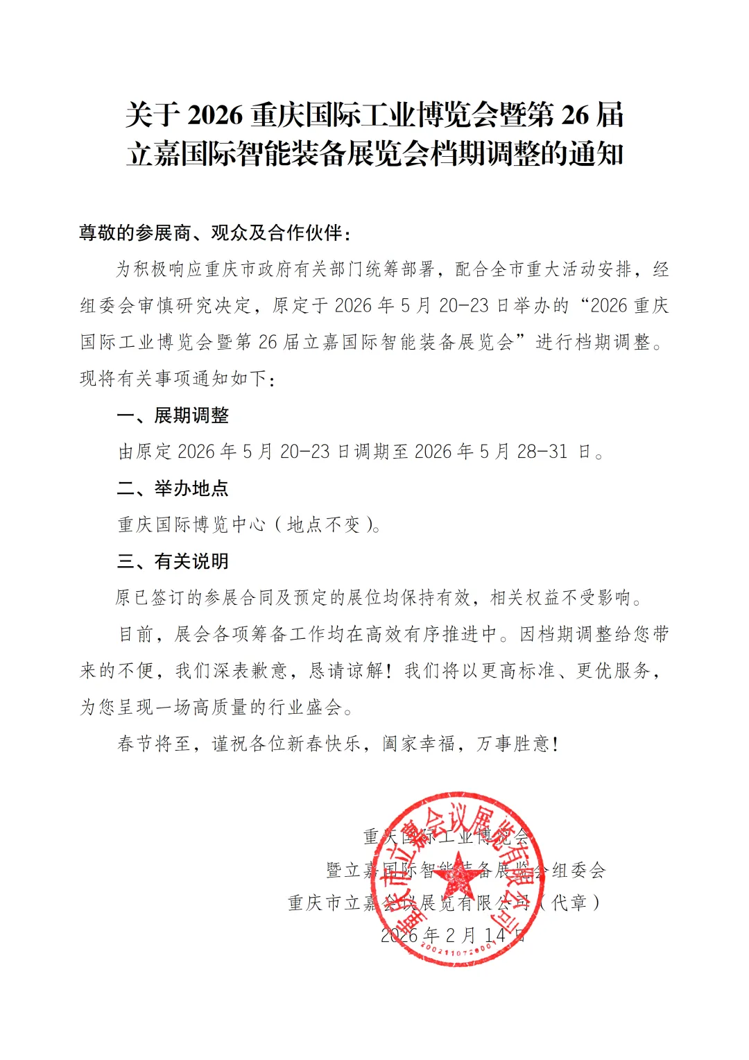 为积极响应重庆市政府有关部门统筹部署,配合全市重大活动安排,经组委会审慎研究决定,“2026重庆国际工业博览会暨第26届立嘉国际智能装备展览会”由原定2026年5月20-23日调期至2026年5月28-31日,地点不变。有关事项通知如下: