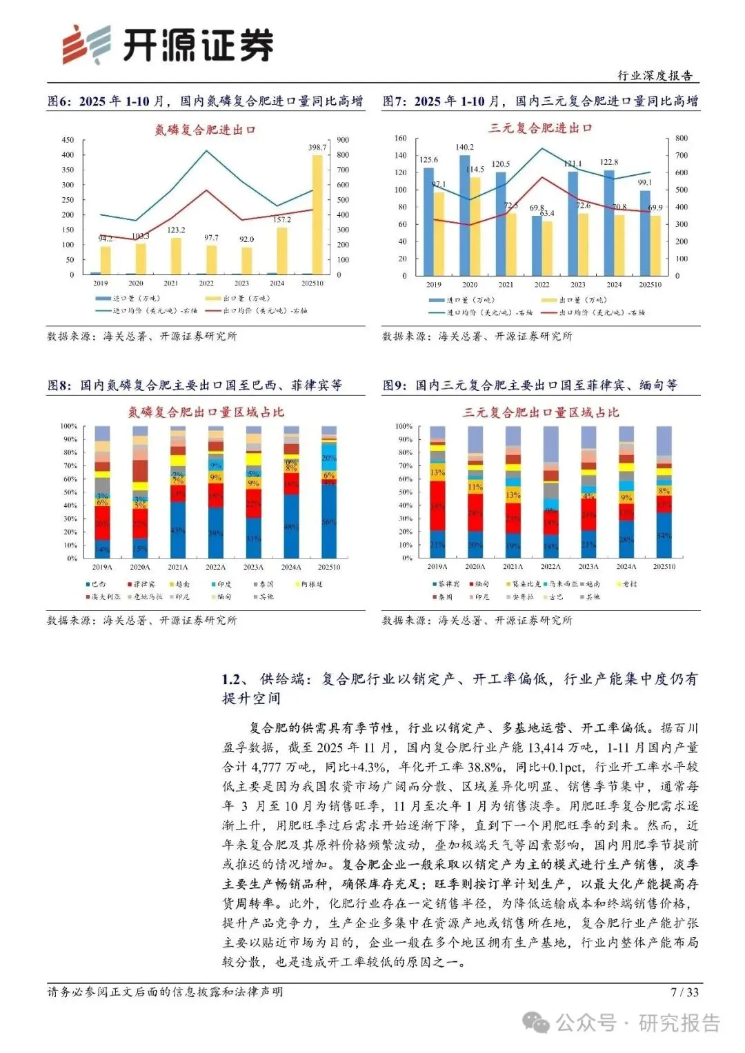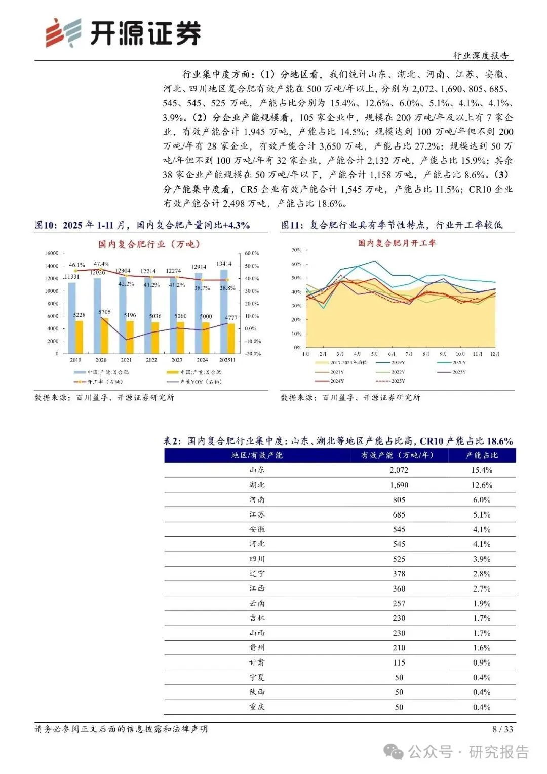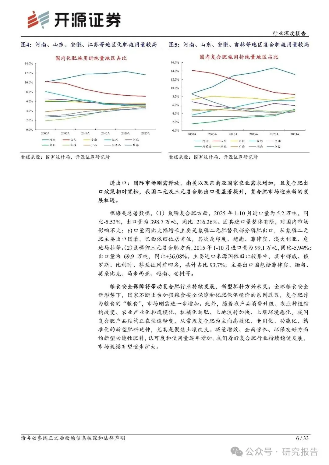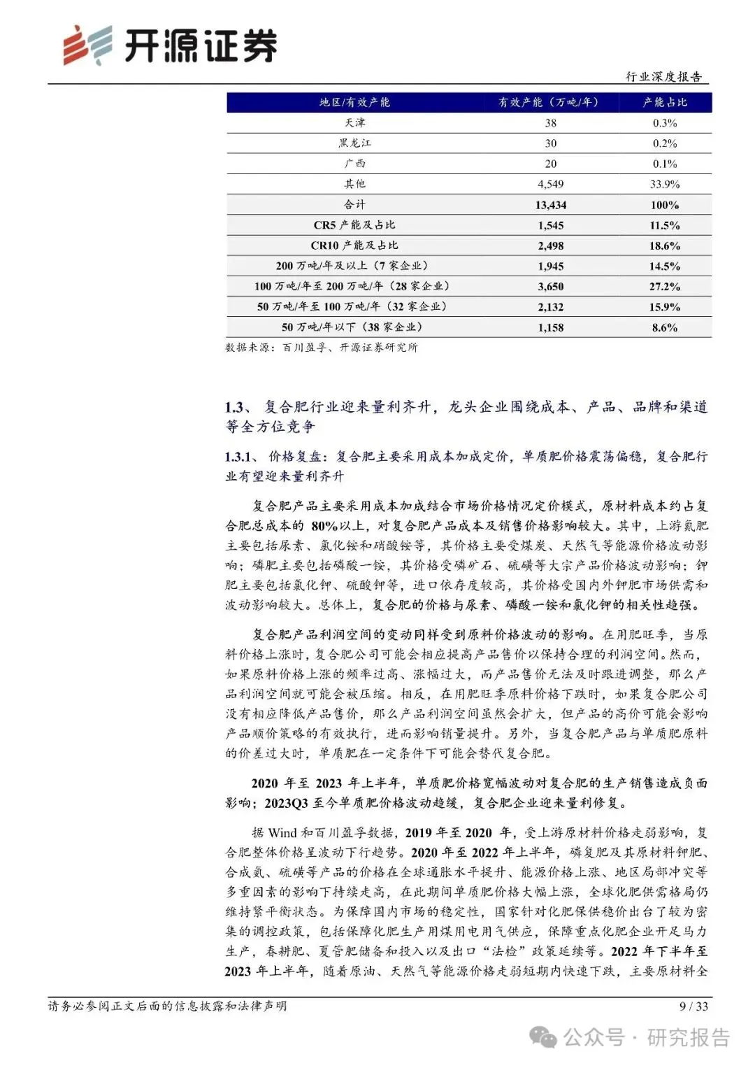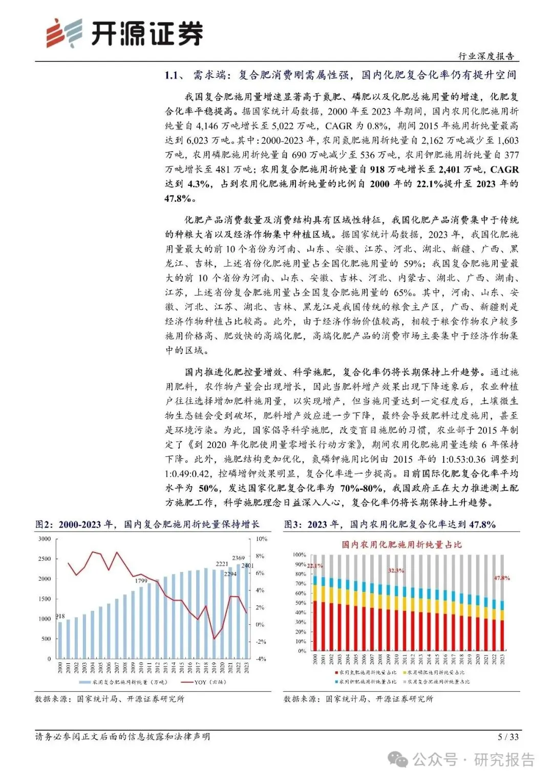 需求端:据国家统计局数据,2000-2023 年国内农用复合肥施用折纯量自 918 万吨增长至2,401 万吨,CAGR 达到 4.3%,增速显著高于氮肥、磷肥以及农用化肥总施用量;2023 年国内化肥复合化率为 47.8%,随着国内推进化肥控量增效、科学施肥,加上复合肥产品结构正向新型肥料加速转变,化肥复合化率仍有提升空间,复合肥使用量和市场规模有望稳步增长。