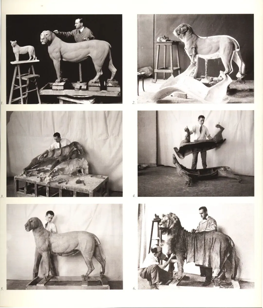 1930年,詹姆斯・L・克拉克 使用与阿克利相似的方法制作狮子标本。图1根据测量数据,用黏土制作动物模型;图2-图5利用动物模型,通过翻模方法制作内模;图6 把鞣制后的皮张粘贴到内模上;最后固定缝合,并进行整理 (图片来源:WINDOWS ON NATURE)