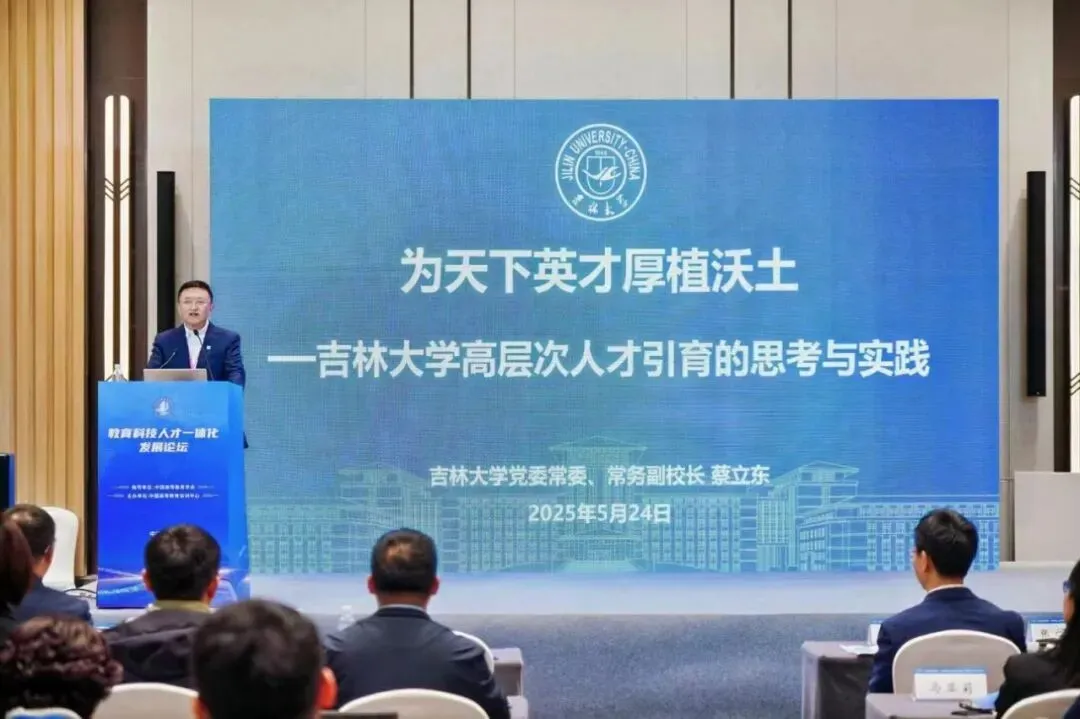 蔡立东以《为天下英才厚植沃土——吉林大学高层次人才引育的思考与实践》为题作主旨发言。他认为,要不断优化引育留用的全链条体系,坚持聚天下英才而用之,统筹做好引进来走出去两大问题,持续扩大开放合作,变地域劣势为引才育才优势,全方位加强人才引进、培育、发展、服务和保障工作。
