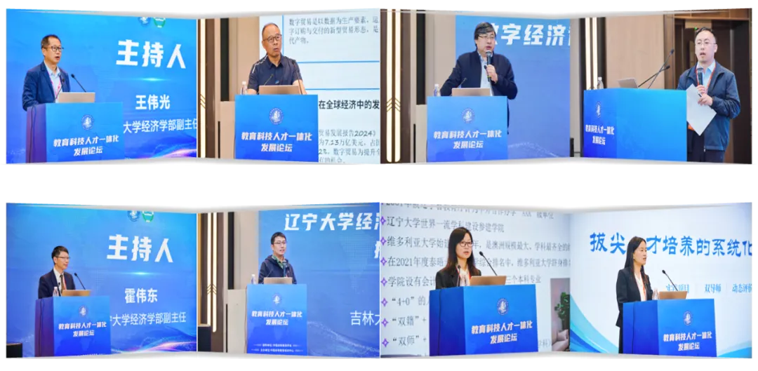 论坛第一阶段主旨报告环节由辽宁大学经济学部副主任王伟光主持,第二阶段交流研讨环节由辽宁大学经济学部副主任霍伟东主持。在深入交流研讨环节,辽宁大学国际经济政治学院院长刘文革教授与丁一兵教授就数字贸易发展趋势与人才培养、辽宁大学经济学院副院长张广辉教授与杨思莹副教授就辽宁大学经济学拔尖学生培养模式探索与实践、辽宁大学亚澳商学院副院长马亚莉教授与赵轩维副教授分别就经管拔尖人才“三维能力”融合培养模式探索——基于合作办学的国际化人才培养支撑和数字经济时代拔尖人才培养的创新实践,相继分享了宝贵经验和深刻见解。
