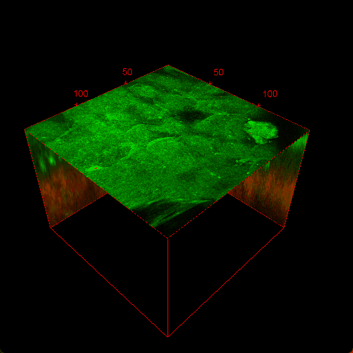 阿尔茨海默症模型小鼠神经元钙信号(红色)、线粒体钙信号(绿色)与淀粉样斑块(蓝色)的三维重建图像