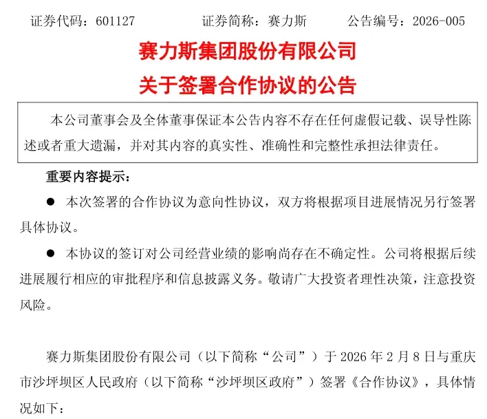 2月8日晚间,赛力斯发布《关于签署合作协议的公告》,公告称,赛力斯于2026年2月8日与重庆市沙坪坝区人民政府签署《合作协议》。根据《合作协议》,赛力斯以蓝电汽车相关存量资产剥离出资设立标的公司,沙坪坝区政府组建或引入有限合伙企业与其他投资人及经营团队,以现金对标的公司增资,各方出资后,沙坪坝区政府相关方持股约33.5%,赛力斯及其指定主体持股约32%,其他投资人持股约18.5%,标的公司搭建员工持股平台持股约16%。标的公司董事会由5人组成,赛力斯委派1人。这也意味着,在资产剥离后,赛力斯对蓝电汽车将不具有控制权,仅为后者的参股股东。(第一财经)