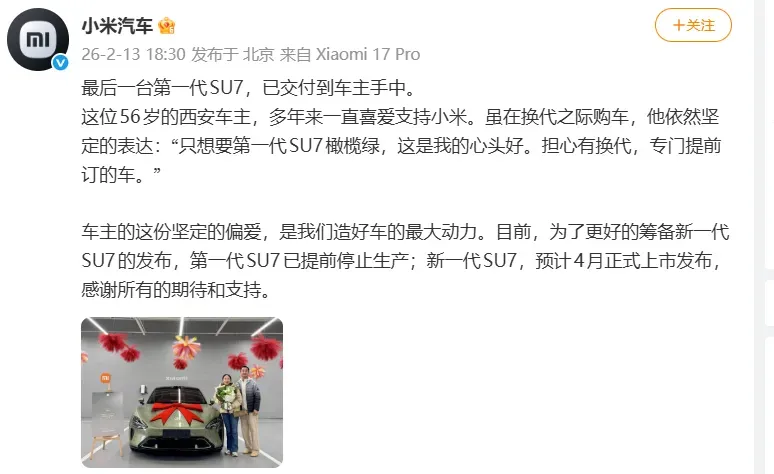 2月13日,小米汽车宣布,最后一台第一代SU7已交付到车主手中。小米汽车介绍,目前,为了更好的筹备新一代SU7的发布,第一代SU7已提前停止生产;新一代SU7,预计4月正式上市发布。小米汽车此前表示,第一代SU7停产之后仍会提供全部维修及保养服务,并且为其准备了充足的配件和供应商生产能力,至少能够满足10年以上的备件保障能力。(界面新闻)