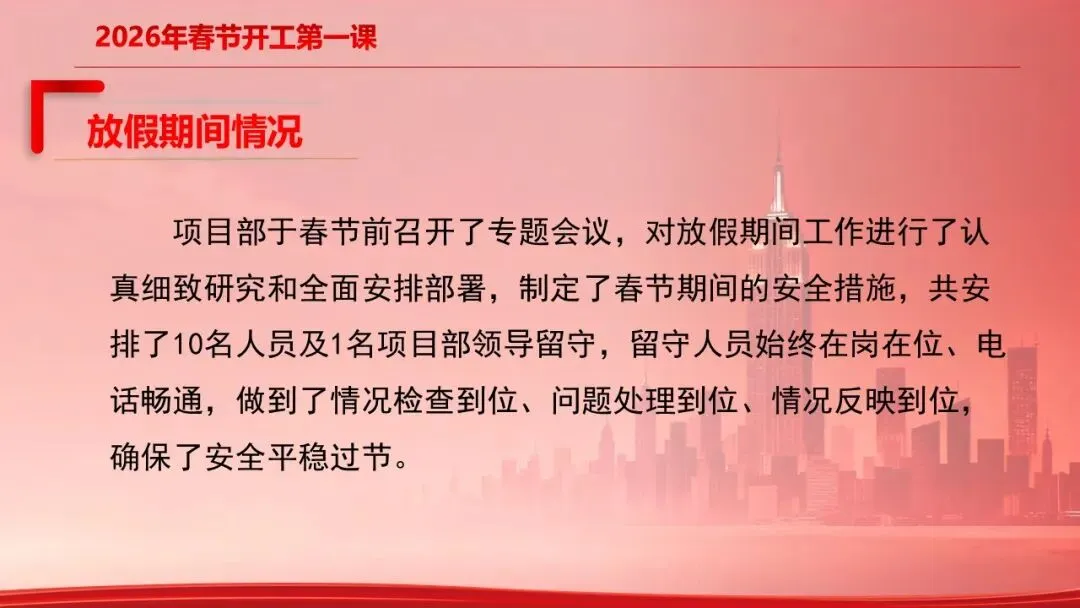 做好开工安全第一课把好安全第一关为防止出现节后员工安全意识懈怠的情况,加强安全管控,部署节后工作重点,加强全员安全意识的树立,为新一年安全工作开好头、起好步!