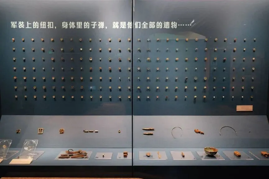 第一单元方山的故事中,有一处十分显眼的南村烈士墓出土的纽扣矩阵展柜,展示了南村考古出土的所有战士遗物,包括陶瓷、帽徽、铜纽扣、塑料牙刷、印章、子弹等小物件,其中数量最多的是纽扣。纽扣背后是战士的“心跳”,见证了战士英勇无畏的牺牲,观众站在这面陈列式“扣子墙”面前,仿佛可以感受到纽扣上的温度。同时,这些小小的遗物不仅展现出烈士们平常生活的一面,更让我们懂得他们不是历史书中的故事,而是有血有肉,为信仰献身的年轻人。