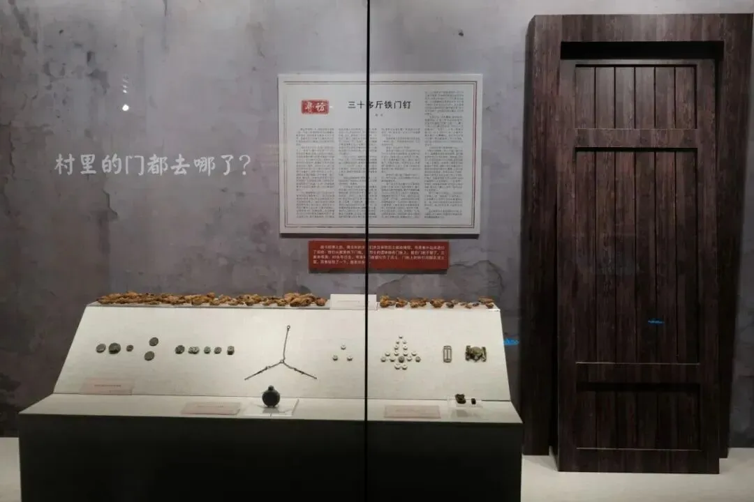 第二单元河北肃宁雪村的故事中,考古出土数量最多的是门钉,足有三十多斤。战场上为何会有门钉?展览中给出了这样的诠释:展陈着一扇未装门环和门钉的门板,旁边的展墙印着“村里的门都去哪了?”的问题,问题下方的陈列柜,正摆放着这些出土的门钉,以此向观众述说背后的故事—当地百姓拆下自家门板,为牺牲的烈士装殓。