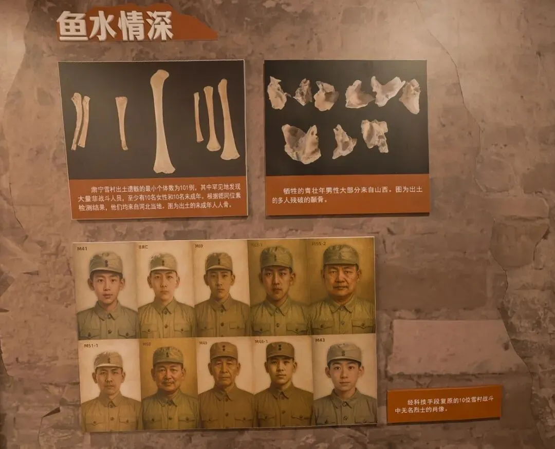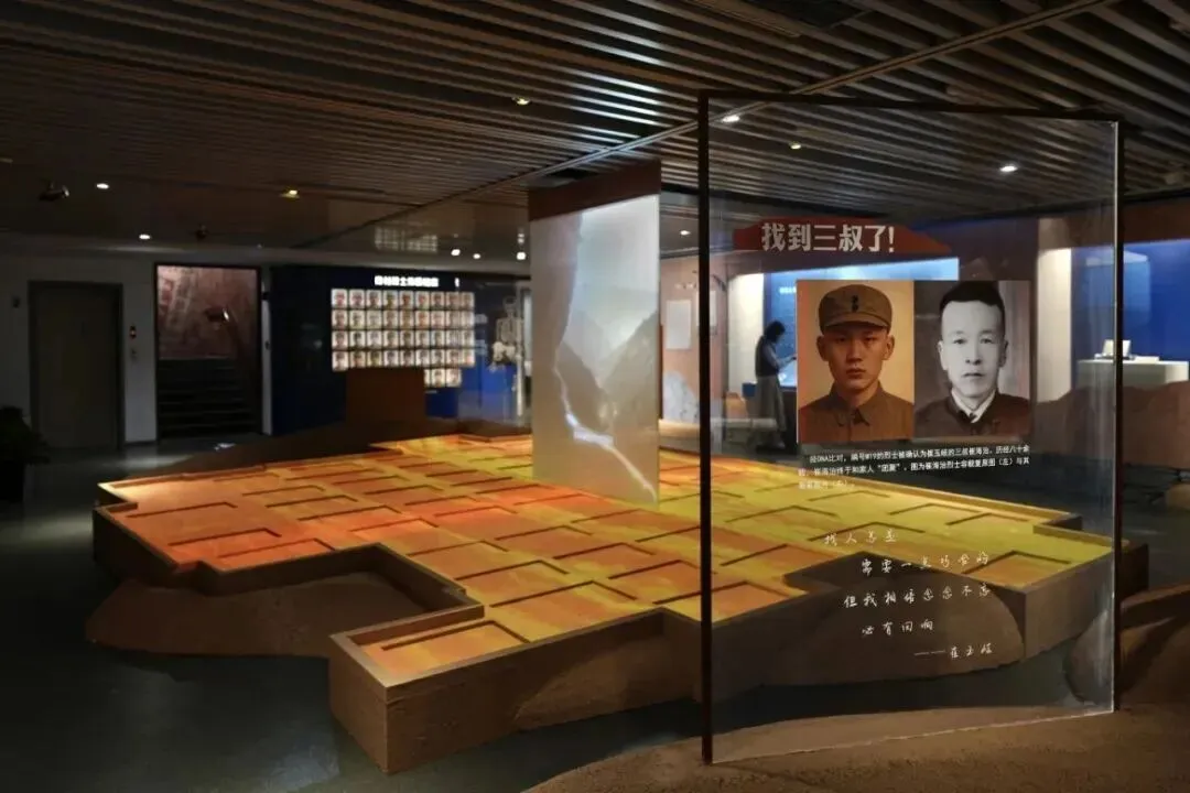 展览融入考古与科技元素,不仅将科技作为创新的展示手段,更将其转化为链接历史与现实的情感纽带。通过DNA鉴定、锶同位素分析、颅面复原等技术,为无名烈士找回姓名与容貌。AI技术为复原肖像披上军装,在保持科学严谨性的同时,赋予了英烈应有的生命尊严。