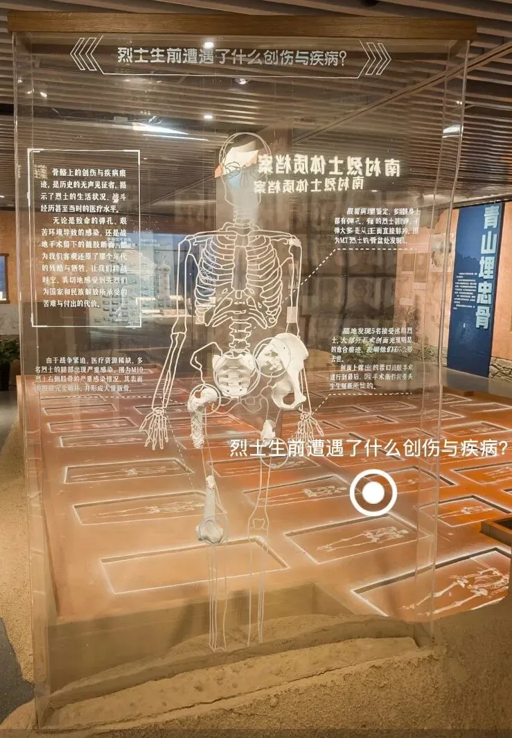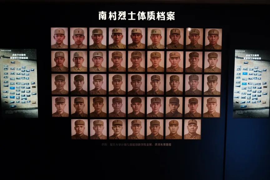 为了让这份“重见天日”的震撼更具感染力,一楼主展区利用等比例沙盘复原了南村烈士墓发掘现场,辅以幻影成像等技术重现发掘瞬间。在南村烈士体质档案互动系统中,观众可以通过屏幕直接“触摸”43位烈士的生命历程。这种从“无名英雄”到鲜活个体的身份重构,不仅消解了历史的疏离感,更让观众在极具温度的交互体验中,完成了与英烈跨越时空的心灵对话。
