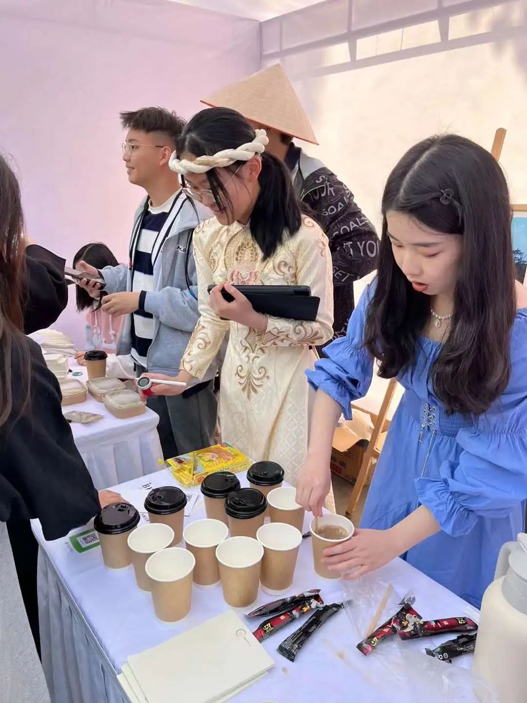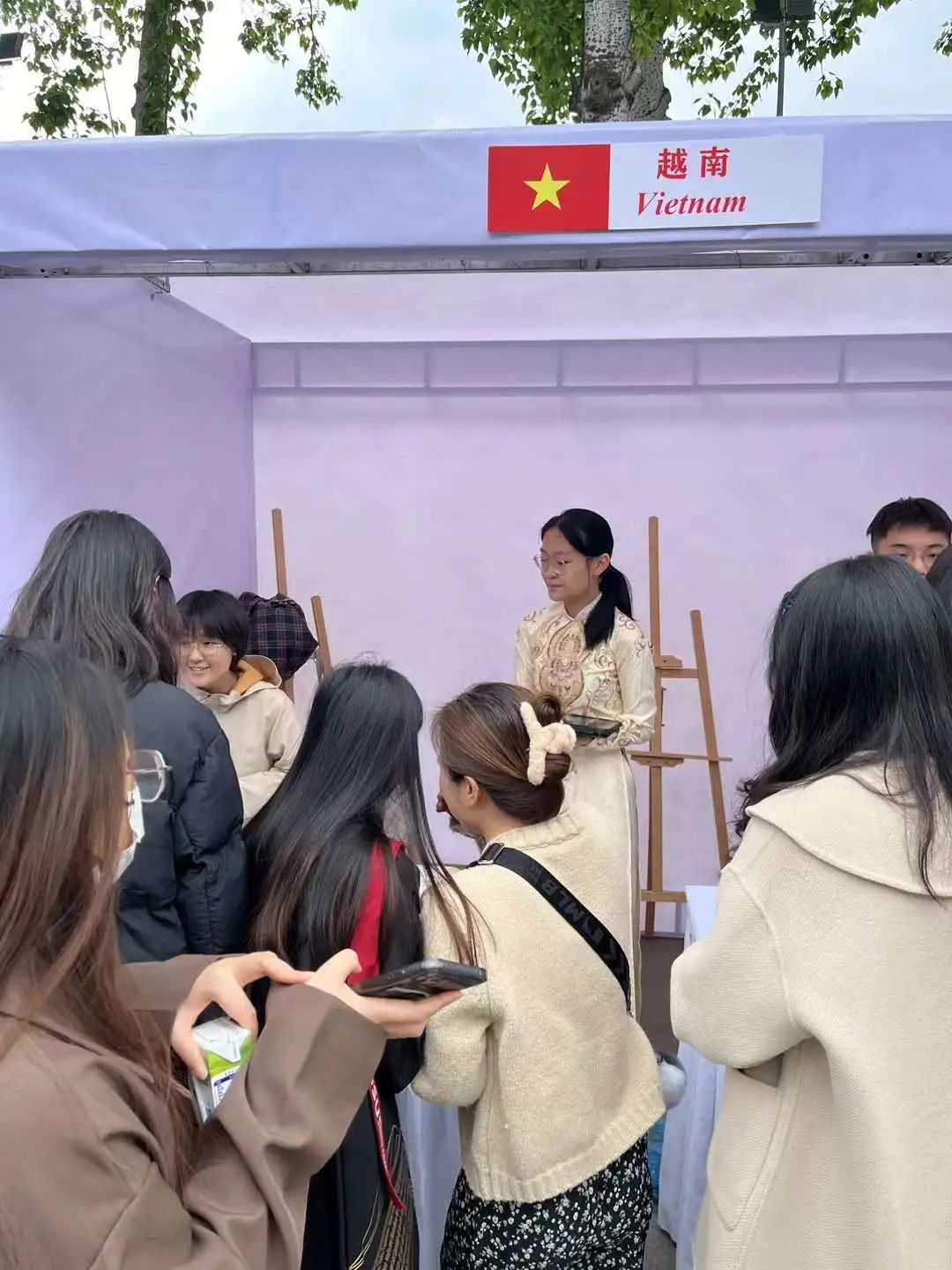 本次万国博览会,越南语展位活动丰富,不仅包含猜汉越词、套圈游戏,也包括越南流行歌曲的播放和越南语专业同学们青春洋溢的舞蹈,同时还有文创以及越南春卷以及越南绿豆糕和咖啡的售卖。活动进行中,越南语展位前人头攒动、十分热闹;越南语展位的食品和文创也获得了老师和同学们的一致好评。