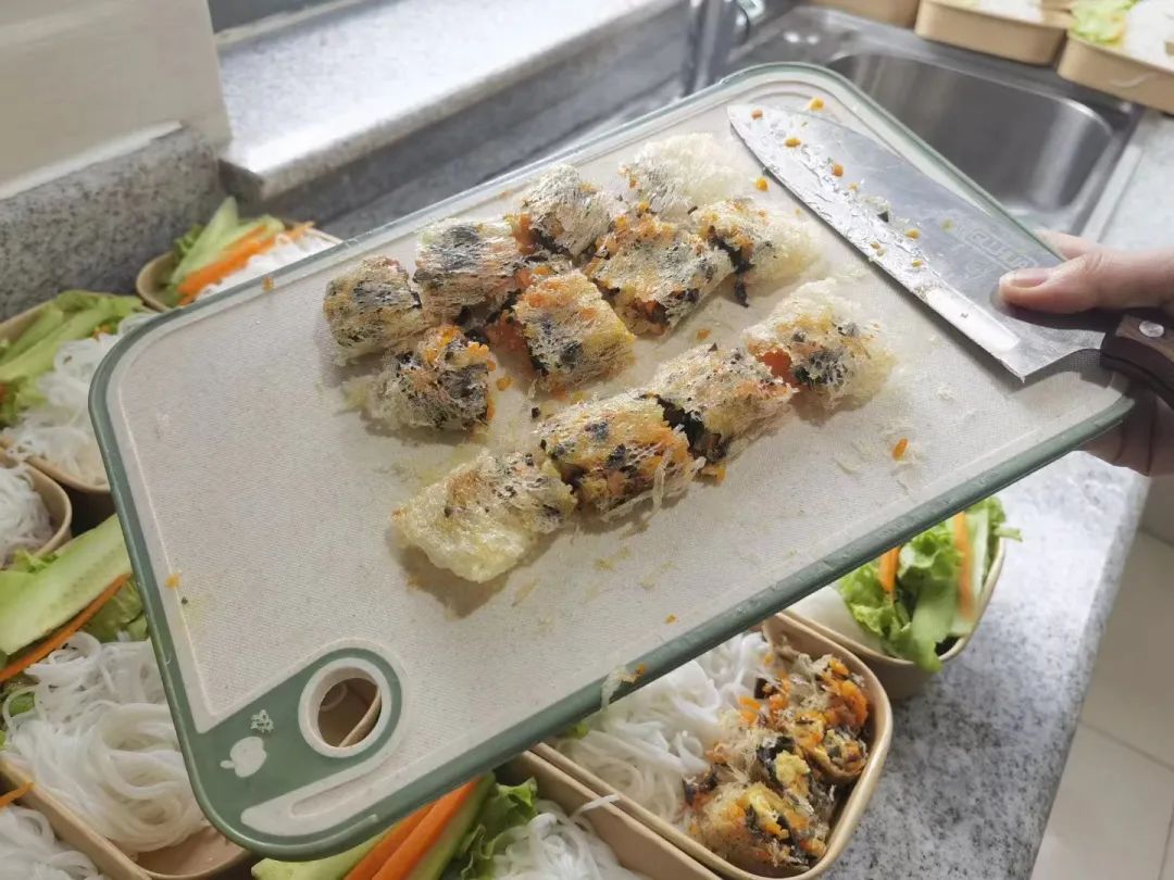 阎箬林同学作为本次越南语专业万国博览会的负责人的负责人,撰写了本次万国博览会的策划案和宣传文案;王薏然同学进行了所需物品的购买;林语佳、王笛云、牛自钰同学和越南留学生阮玉琼茹同学在活动当天上午一起制作了越南春卷和米粉,春卷的图片流出后,老师和同学们垂涎欲滴,对下午的活动更加期待。