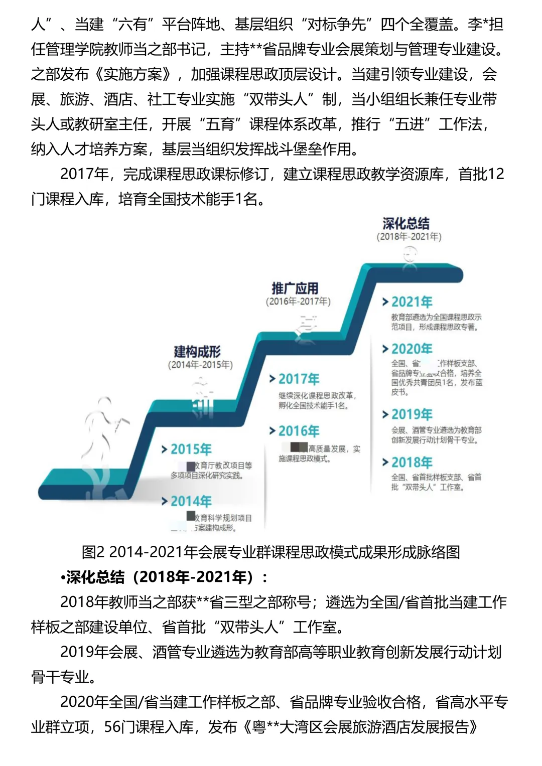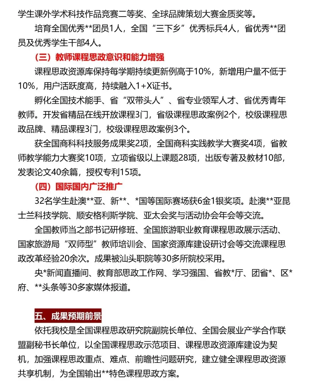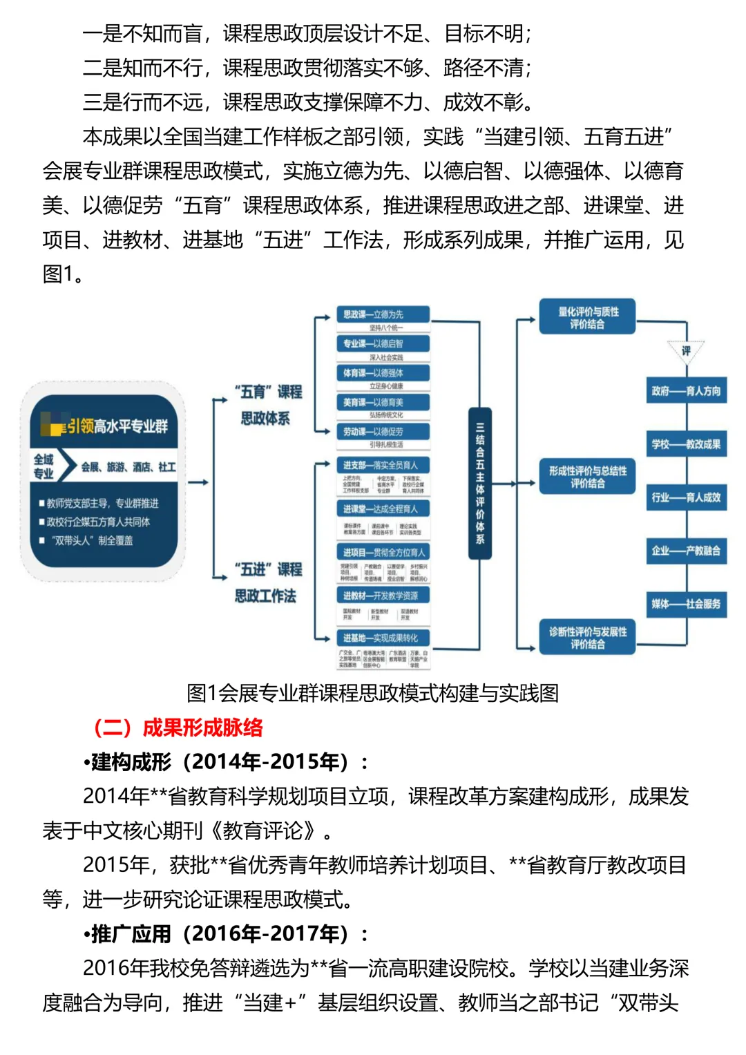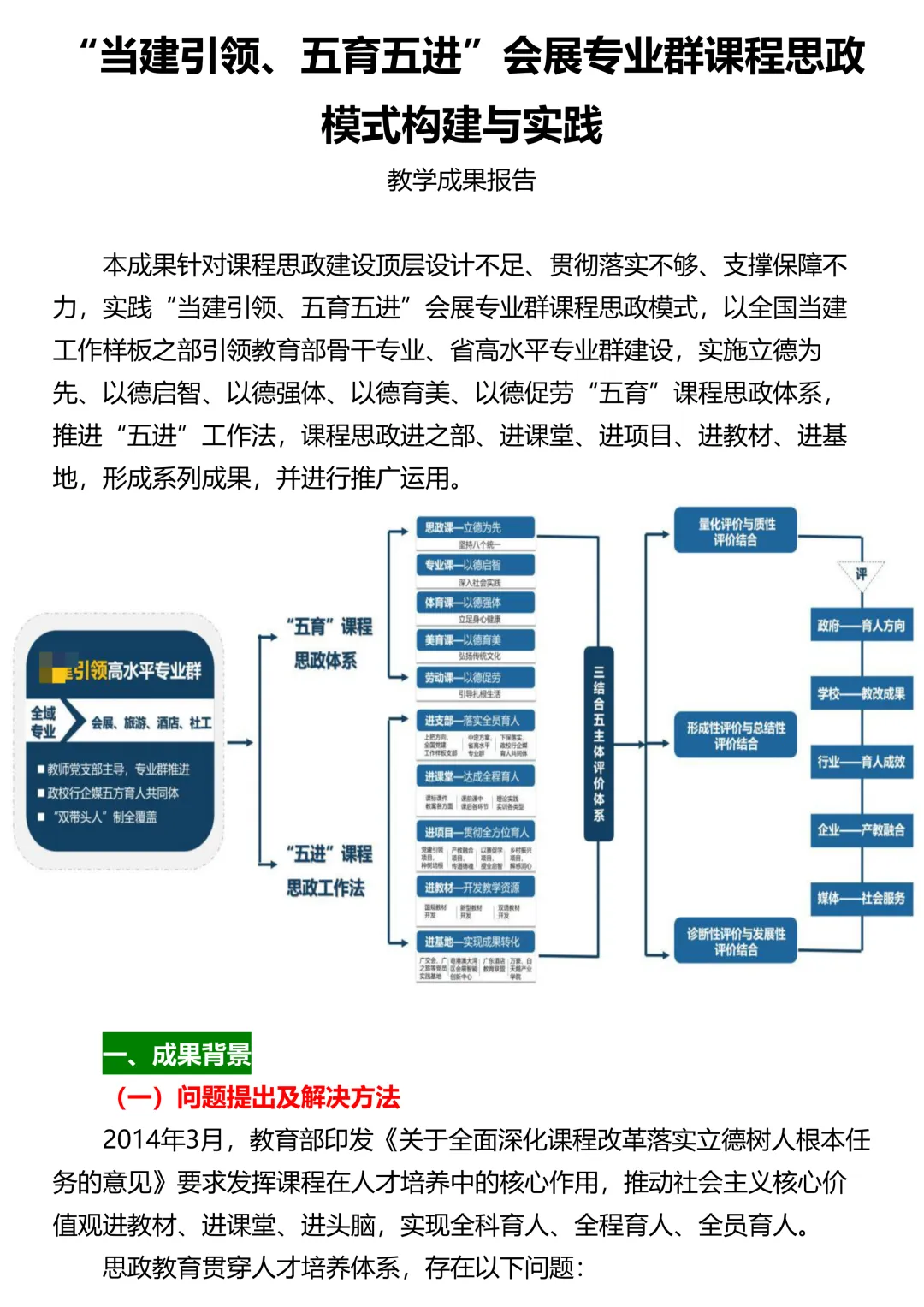 本成果针对课程思政建设顶层设计不足、贯彻落实不够、支撑保障不力,实践“当建引领、五育五进”会展专业群课程思政模式,以全国当建工作样板之部引领教育部骨干专业、省高水平专业群建设,实施立德为先、以德启智、以德强体、以德育美、以德促劳“五育”课程思政体系,推进“五进”工作法,课程思政进之部、进课堂、进项目、进教材、进基地,形成系列成果,并进行推广运用。