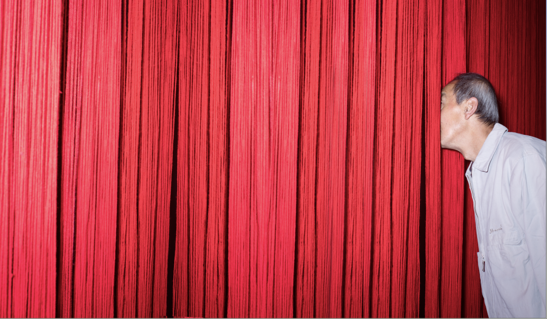 油画布的运用营造出生动的剧场氛围,而艺术家冯立的摄影作品则充分利用了油画布的空间层次,使对图像的解读向多平面、多维度延伸——人物将头埋入油画布的“偷窥”行为与剧场和展区的“公众特征“形成对立,在窥视之中触碰“边界”,强化空间的戏剧性与反差感。