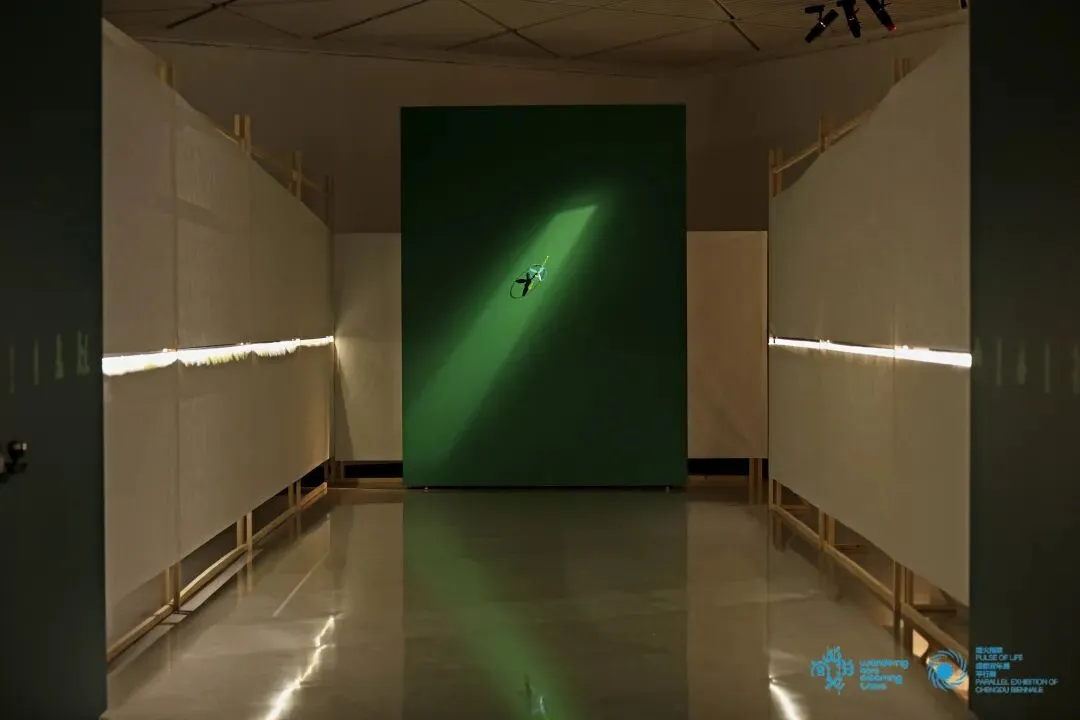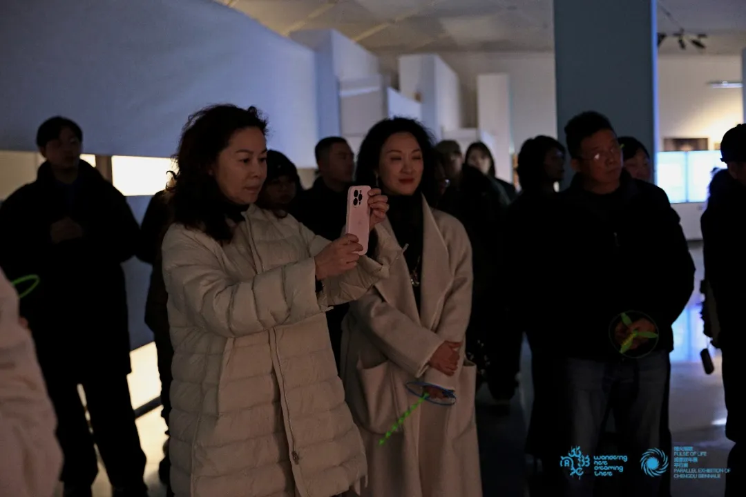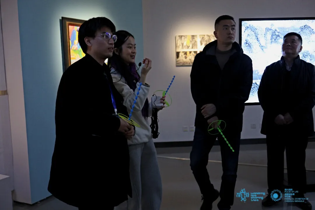 开幕仪式后,嘉宾们进入展厅,在策展团队王楠、郑淏文、邱露瑶的导览下参观展览。展厅内部被打造成一个充满想象力的多感官空间,一系列兼具互动性与学术深度的艺术作品,带领观众经历从漂移、升空、悬浮到回归丘陵的精神旅程。这场别样的观展体验,让观众在游走中理解当代艺术的表达方式与思维逻辑,思考“神”的多重意涵,一同神游在展厅、巴蜀大地与神工、神韵、神思中。