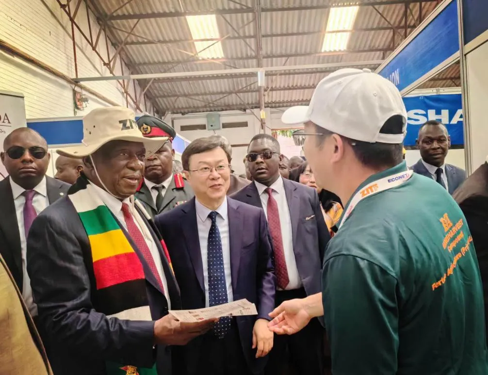 2024年4月23日至27日,第64届津巴布韦国际贸易博览会(ZITF)在布拉瓦约市成功举办,姆南加古瓦总统在参观中国馆时与中方企业、机构热情互动。 图源:商务部-驻津巴布韦共和国大使馆经济商务处