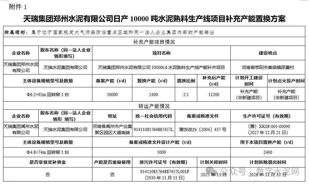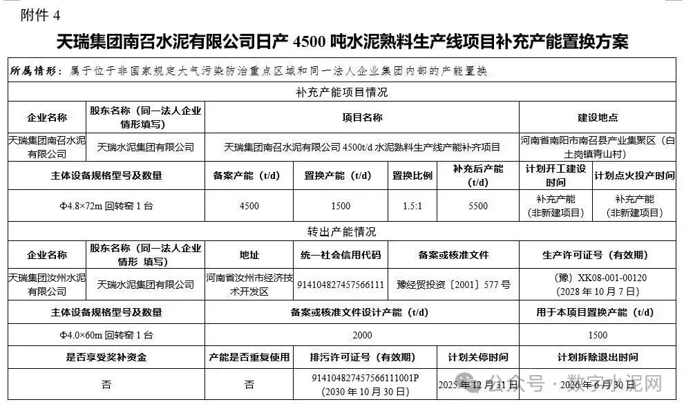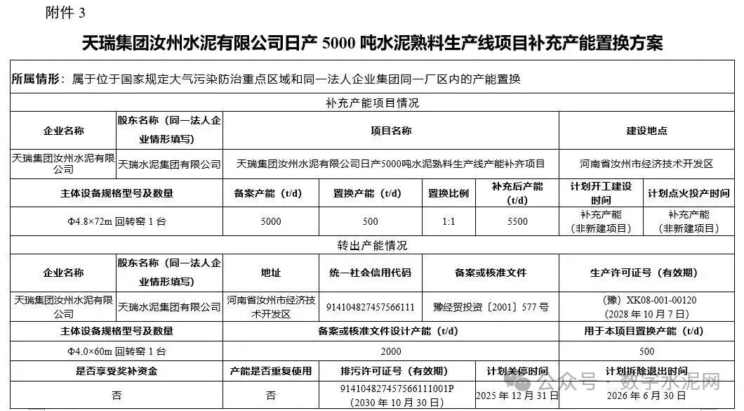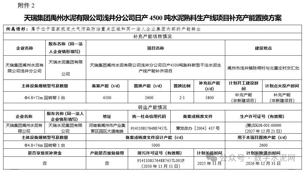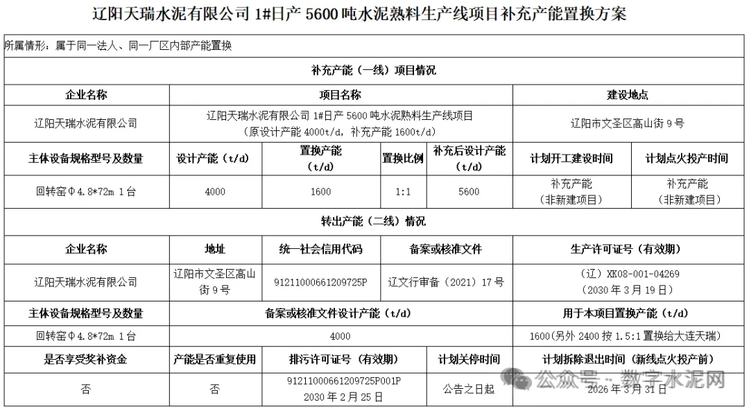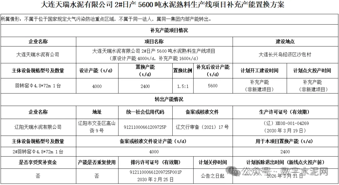 2026年1月16日,辽宁省工业和信息化厅发布《关于辽阳天瑞水泥有限公司日产5600吨水泥熟料生产线项目补充产能置换方案的通告》和《关于大连天瑞水泥有限公司日产5600吨水泥熟料生产线项目补充产能置换方案的通告》