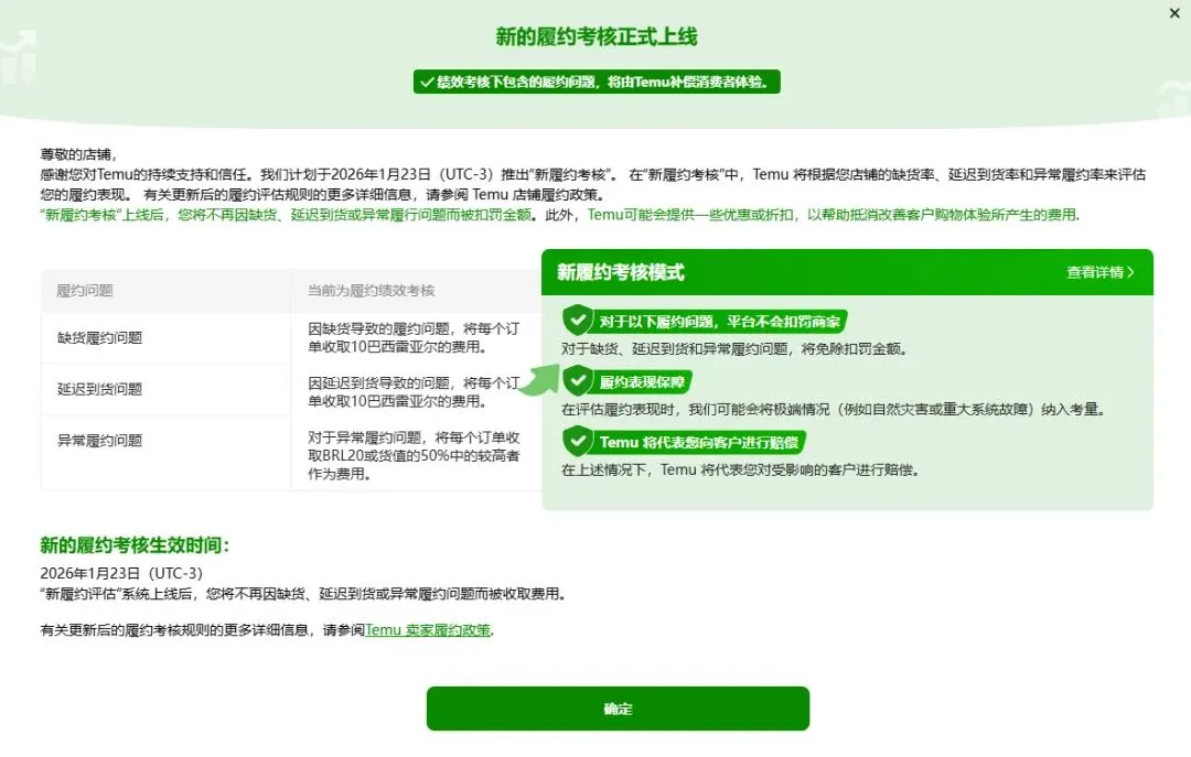 自2026年1月23日(UTC-3)起,Temu巴西站点将正式执行新履约考核机制,核心变化如下: