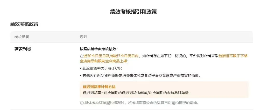 • 近30天/7天延迟到货率≥6%,或问题严重影响消费者体验,平台将采取下架全店商品、限制上新等措施。