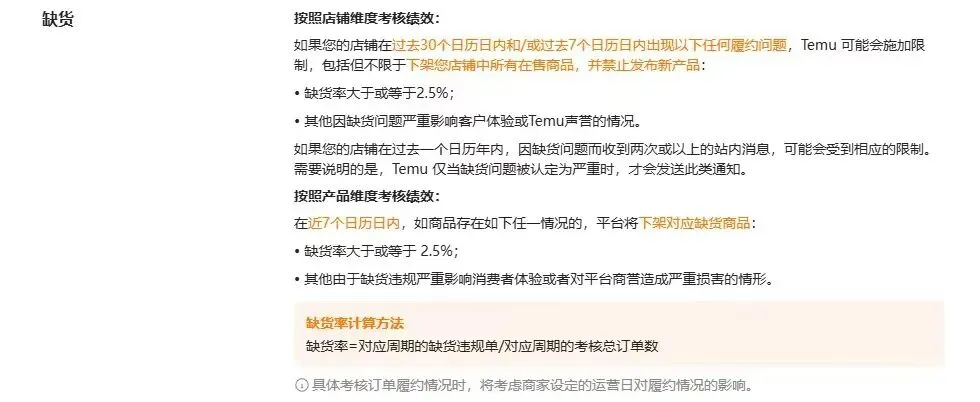 • 店铺维度:近30天/7天缺货率≥2.5%,或1年内因缺货收到2次及以上站内信,将面临全店商品下架、禁止发布新品等限制。