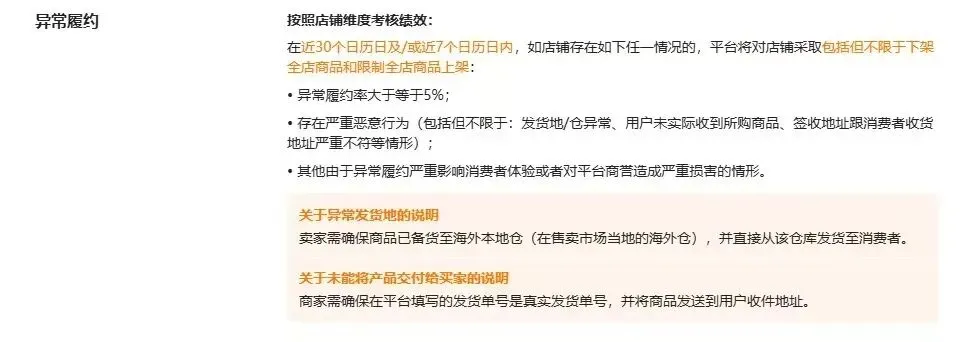 • 近30天/7天异常履约率≥5%,或存在虚假发货、异常发货地、签收地址不符等恶意行为,平台将执行全店商品下架、限制上架等处罚。