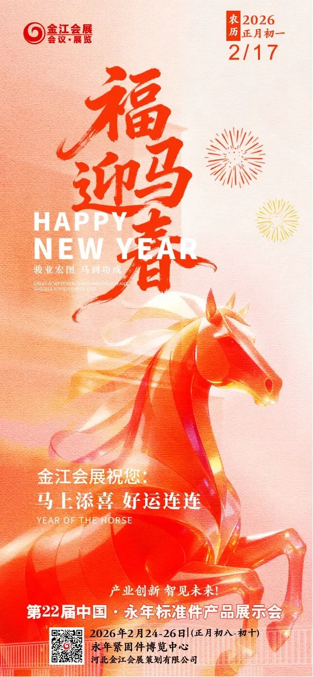 值此马年新春佳节到来之际,金江会展总经理王涛携全体员工恭贺大家节日快乐,阖家幸福,生意兴隆,诸事顺达 。回顾2025,我们以信念为舵,以匠心为桨,圆满完成三大行业盛事:第21届永年标准件产品展示会、第4届华北(邯郸)光伏新能源暨建筑机电抗震博览会、第17届中国永年紧固件及设备展览会,为产业交流搭建优质桥梁,以专业与热忱赢得广泛赞誉。展望2026,我们将秉持初心,勇毅前行,继续深耕三大展会平台,持续优化展会服务,与新老伙伴同心同行,以创新为引擎,以质量为基石,共塑紧固件产业新高度。聚力高端化引领、数智化赋能、融合化发展,携手擘画永年会展业的璀璨未来!2026第22届永年标准件产品展示会即将于正月初八到初十在永年紧固件博览中心举行,目前一切工作准备就绪,欢迎新老朋友届时光临展会,深化行业交流,共谋产业发展。骐骥驰骋,势不可挡!让我们拿出跃马扬鞭的勇气,激发万马奔腾的活力,执着马到成功的愿景,一起为梦想努力,为幸福打拼,为事业奋斗,把美好变成现实。