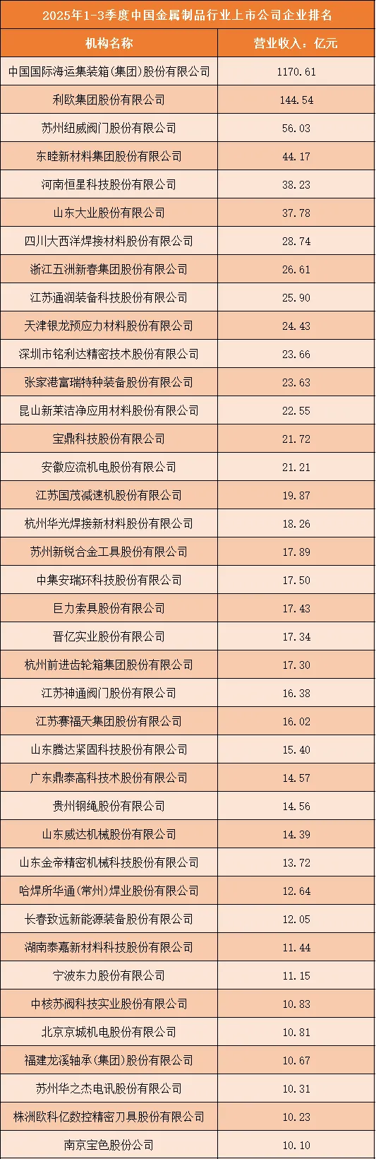 根据申万行业分类,2025年1-3季度中国金属制品行业上市公司按营业收入排名如下:(A股上市公司)