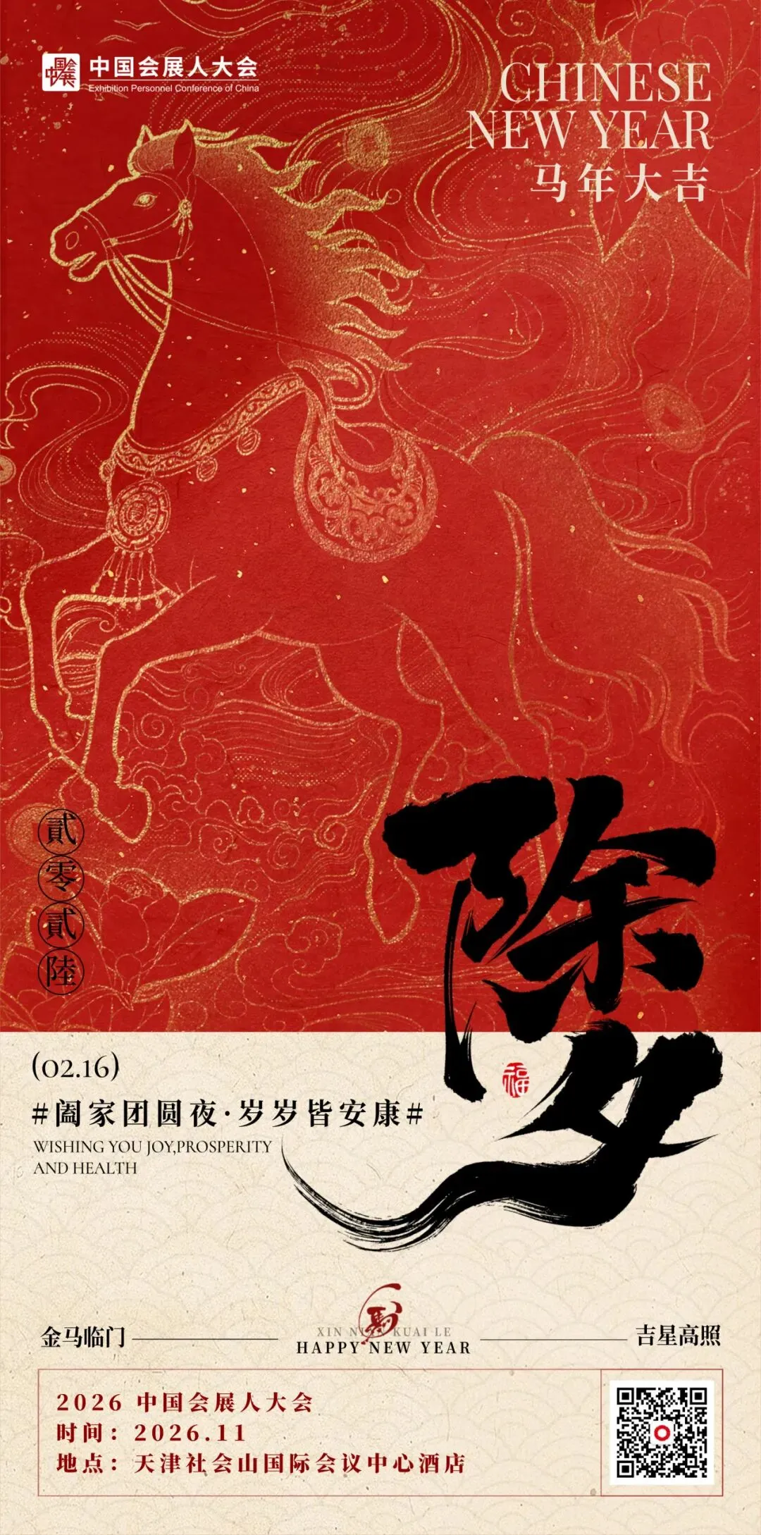 辞旧迎新,不负耕耘。愿您除夕喜乐、阖家安康,马年策马扬鞭、大展宏图。加入中国会展人俱乐部,以圈层聚合力,以专业赴新程,共绘会展行业新蓝图!
