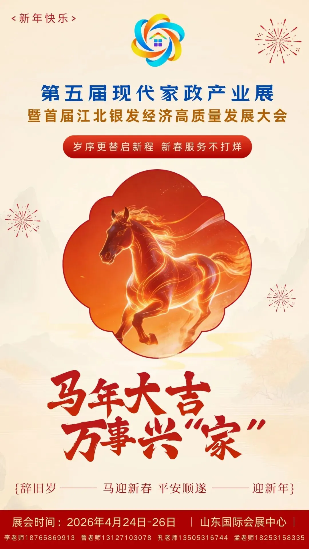 岁序更替,华章日新。当丙午马年的蹄声渐近,新春的脚步已悄然临近。在这阖家团圆、辞旧迎新的美好时刻,第五届现代家政产业展暨首届江北银发经济高质量发展大会组委会,向一直以来支持与厚爱家政务产业展的各界同仁、合作伙伴与行业挚友,致以最诚挚的新春问候与衷心的感谢!