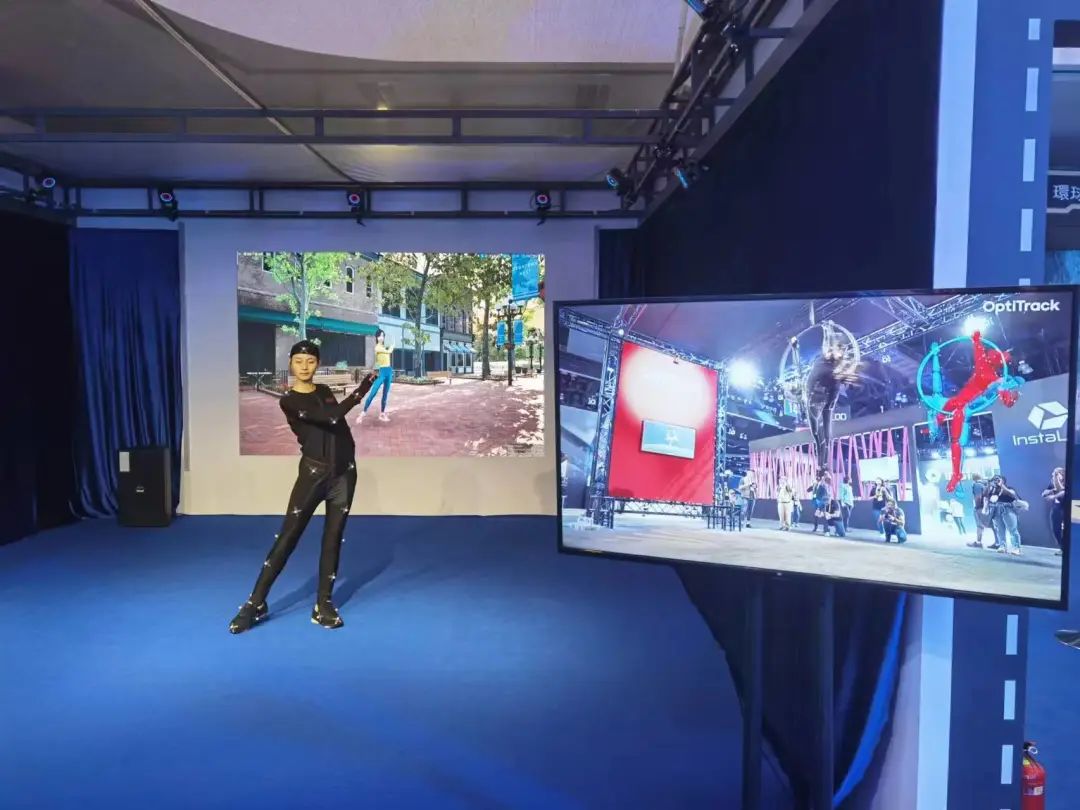 虚实合一,数智融合。展会现场,一段炫酷的动捕表演吸引了大量与会领导和嘉宾驻足观看。只见专业演员身穿OptiTrack动捕服不断舞动,动作干脆利落,被实时驱动的数字人如同有了生命一般舞姿轻盈,流畅优美,精彩的表演获得了大家的一致称赞。