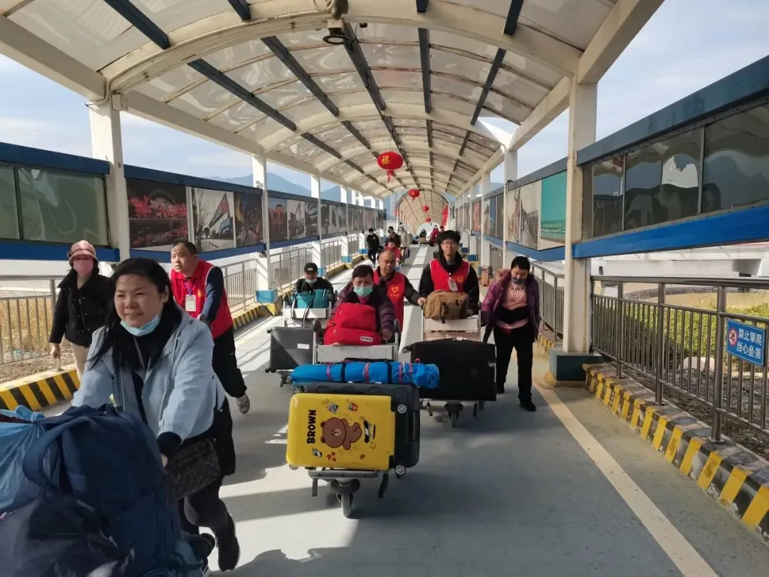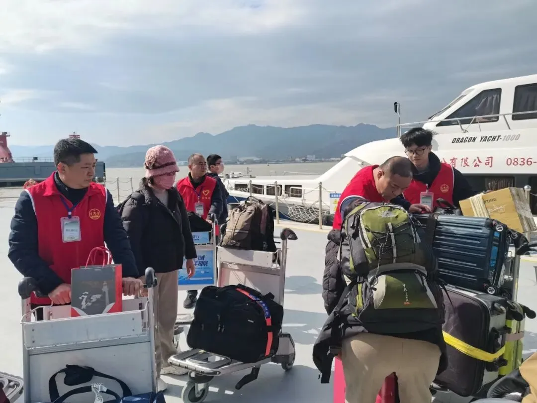 在登船通道,身着红色马甲的志愿者们格外醒目。他们主动接过入闽旅客手中沉重行李,协助搬运至指定区域。一位行动不便的老者松了口气:“箱子实在太重了,多亏你们帮忙!”志愿者们还细心准备了便携小推车,为老年旅客提供便利。短短百米通道,一次次接过、一趟趟往返,传递着跨越海峡的暖心关怀。