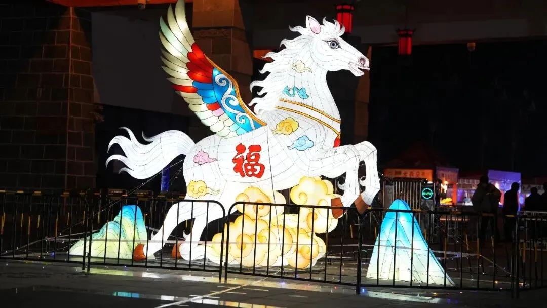 以马年新春为主题的祥马花灯昂首扬蹄、灵动传神;融合传统神话故事的人物花灯造型别致、色彩艳丽;国潮花卉、吉祥图案等主题灯组错落分布。光影交织间,整个景区化作一片流光溢彩的灯海,处处洋溢着欢乐祥和的新春气息。