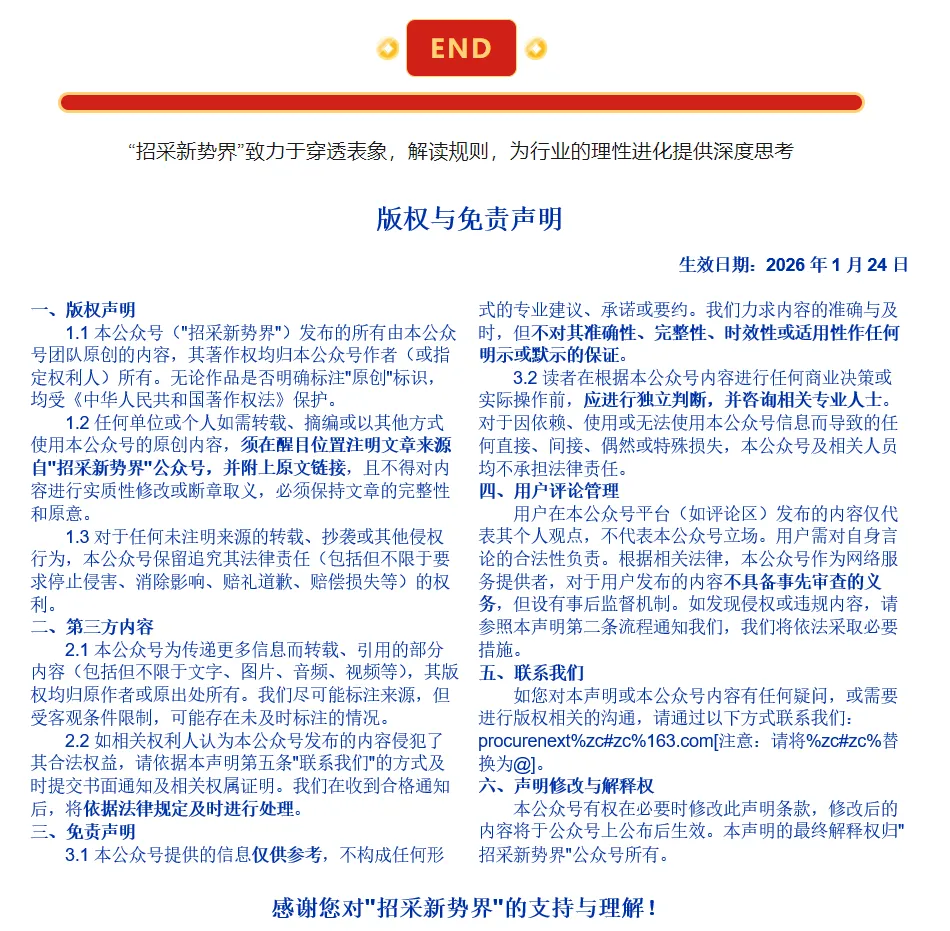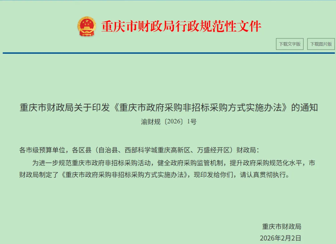 2月2日,重庆市财政局出发布《重庆市政府采购非招标采购方式实施办法》(渝财规〔2026〕1号),用于规范重庆市采用非招标采购方式的政府采购活动。该办法自2026年3月1日起生效,是重庆市执行非招标采购的最新依据。
