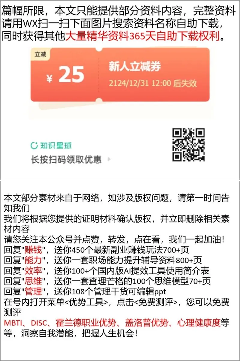 战略评价体系确保落地效果。方案设计了基于平衡计分卡的绩效管控机制,从财务、客户、运营、学习与成长四个维度提炼关键成功要素,分解为 KPI 与关键任务,签订组织绩效目标责任书与个人绩效承诺。同时建立绩效考核、业绩监控、及时调整的动态评价机制,针对变革幅度、决策效率、专业能力、组织活力等潜在风险,制定了针对性应对措施。