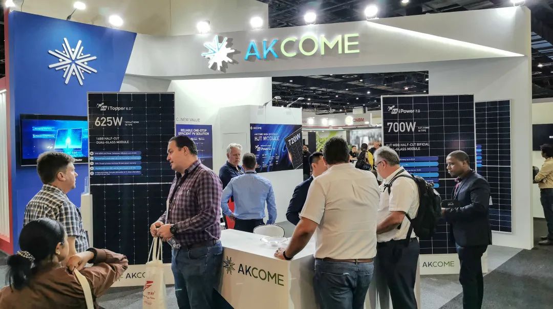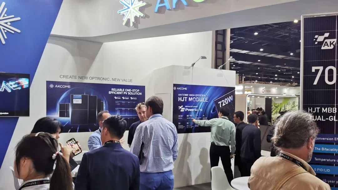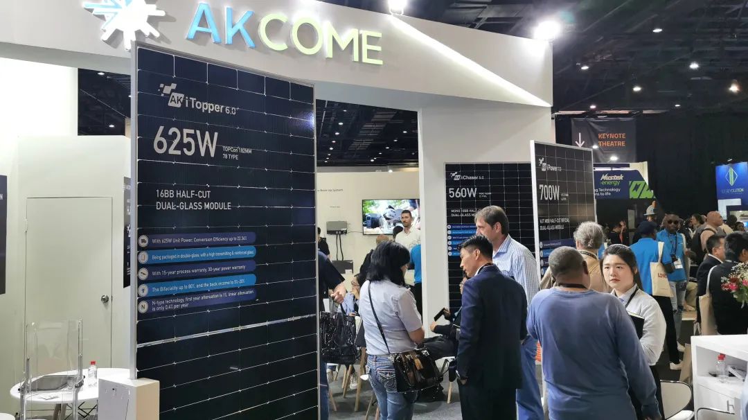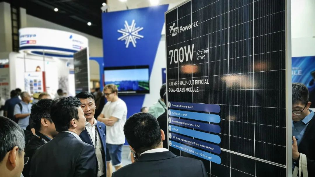 中东地区高温炎热、地形复杂且多沙尘暴,对光伏组件的耐候性提出了要求,而爱康展出的明星产品AK iPower7.0系列的高效异质结组件,则实现了对中东地区地面电站项目的完美适配。这款组件搭载了66片210mm异质结电池片,采用双面双玻设计,效率高达23.2%,双面率高达85-95%,最高功率突破700W。异质结电池温度系数低至-0.24%/℃,远低于PERC电池(-0.35%/℃)和TOPCon电池(-0.30%/℃),在高温环境下发电表现出色,功率损耗更小,可有效降低系统度电成本。此外,爱康异质结组件还具备高双面率、强弱光响应、无光致衰减等优势,可为中东光伏电站带来更优异的综合经济效益。