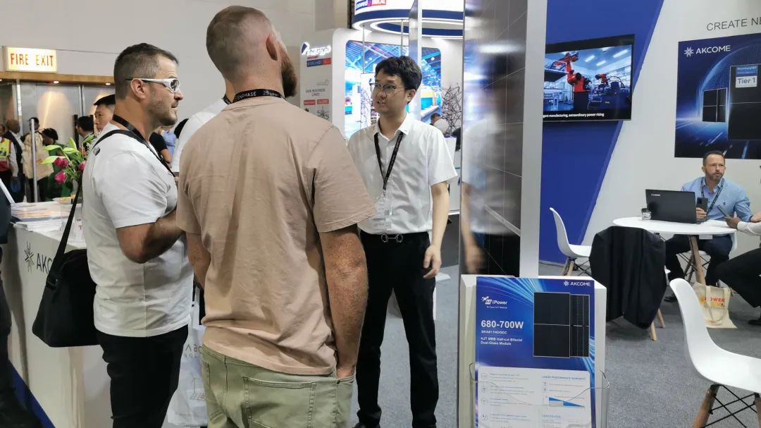 自开展首日至今,爱康凭借高性能的产品和高效率的创新技术,在展会上大放异彩,成为现场一道亮丽的风景线。爱康展台人气高涨,参观洽谈者络绎不绝。爱康工作人员热情高涨,耐心地为前来咨询的参展客户答疑解惑。