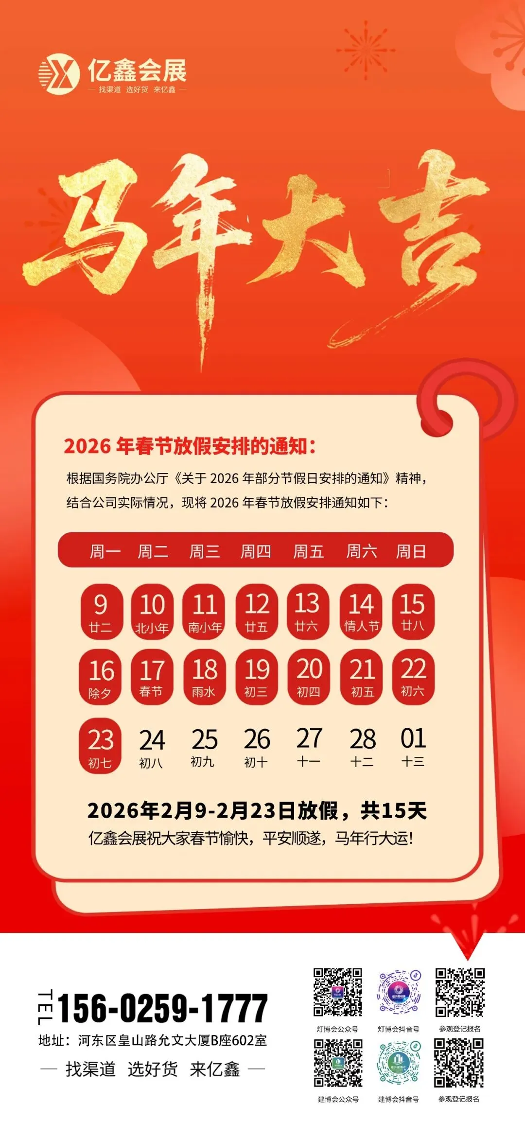 转眼已是岁末,感谢大家一路以来的陪伴与支持。值此2026丙午马年新春佳节来临之际,为让全体伙伴、各位朋友度过一个平安、喜乐、祥和的假期,结合实际情况,现将新春放假安排正式通知如下: