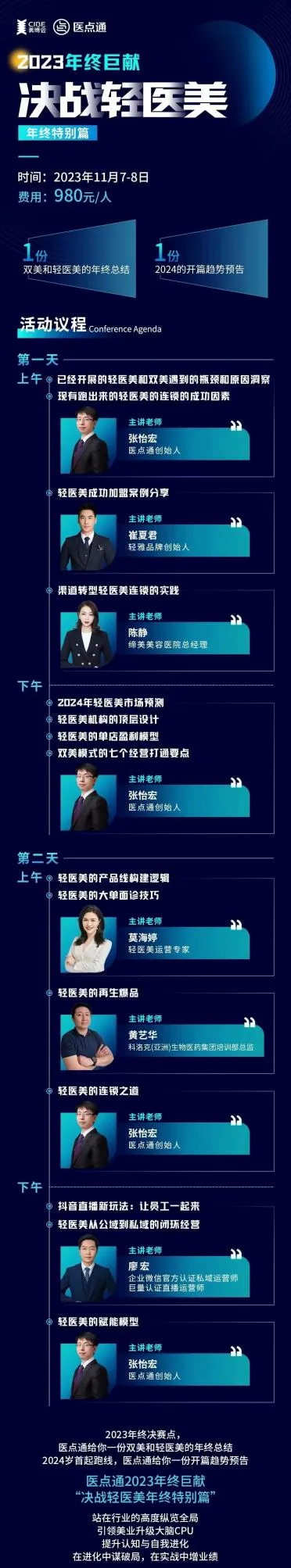 2023年11月7-8日,深圳国际大健康美丽产业博览会联合深圳市医点通管理咨询有限公司隆重推出“决战轻医美特别版”——轻医美高峰论坛,隆重邀请重量级行业一线大咖与资深运营导师,以实战解码方式,现场深度剖析轻医美单店盈利模型,轻医美产品线设计、爆品打造以及流量爆破体系构建。与资深行业人员交流轻医美行业的经营方式。