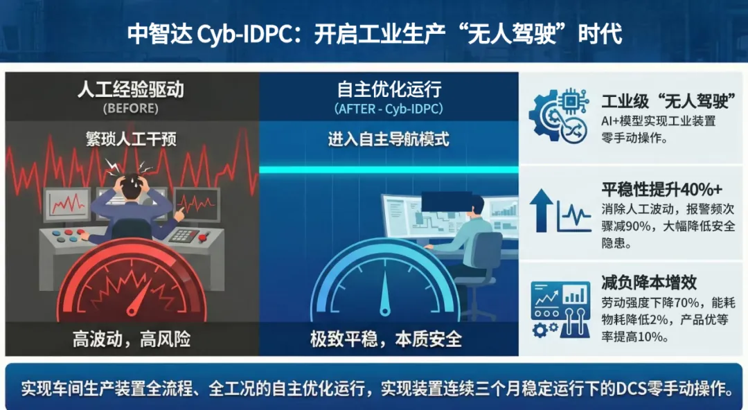 中智达融合先进控制(APC)与AI技术,首创复杂工业过程全工况自主优化运行核心技术体系,自主研发智能动态优化控制软件(Cyb-IDPC,国内首版次),为工业企业提供零手动操作解决方案,实现工业装置的“无人驾驶”。先后荣获中国标准创新贡献奖一等奖、浙江省技术发明奖一等奖和中国石油化工自动化行业科技进步奖一等奖,达到国际领先水平。